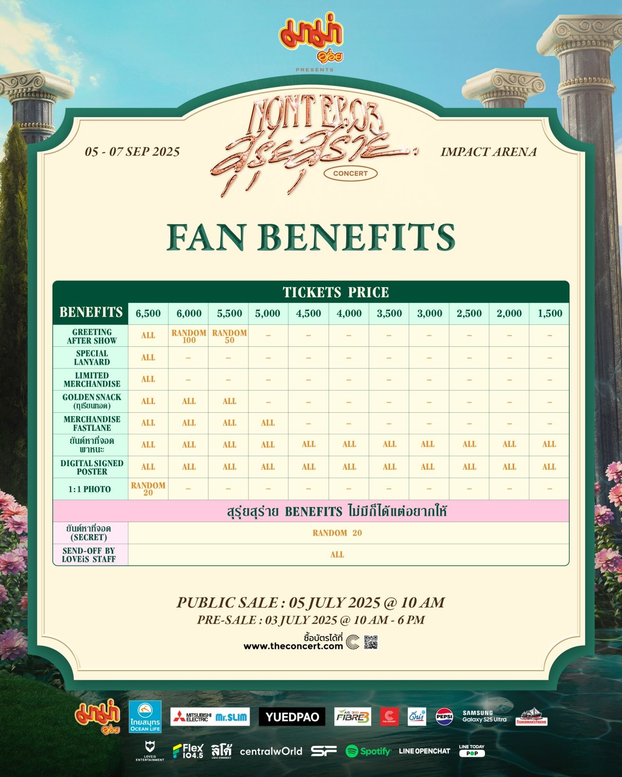 คอนเสิร์ตจัดทั้งหมด 3 รอบเท่านั้น! วันที่ 5, 6, 7 กันยายน 2568 เวลา 19.00 น. ณ IMPACT ARENA เมืองทองธานี บัตรราคา 6,500, 6,000, 5,500, 5,000, 4,500, 4,000, 3,500, 3,000, 2,500, 2,000, 1,500 บาท