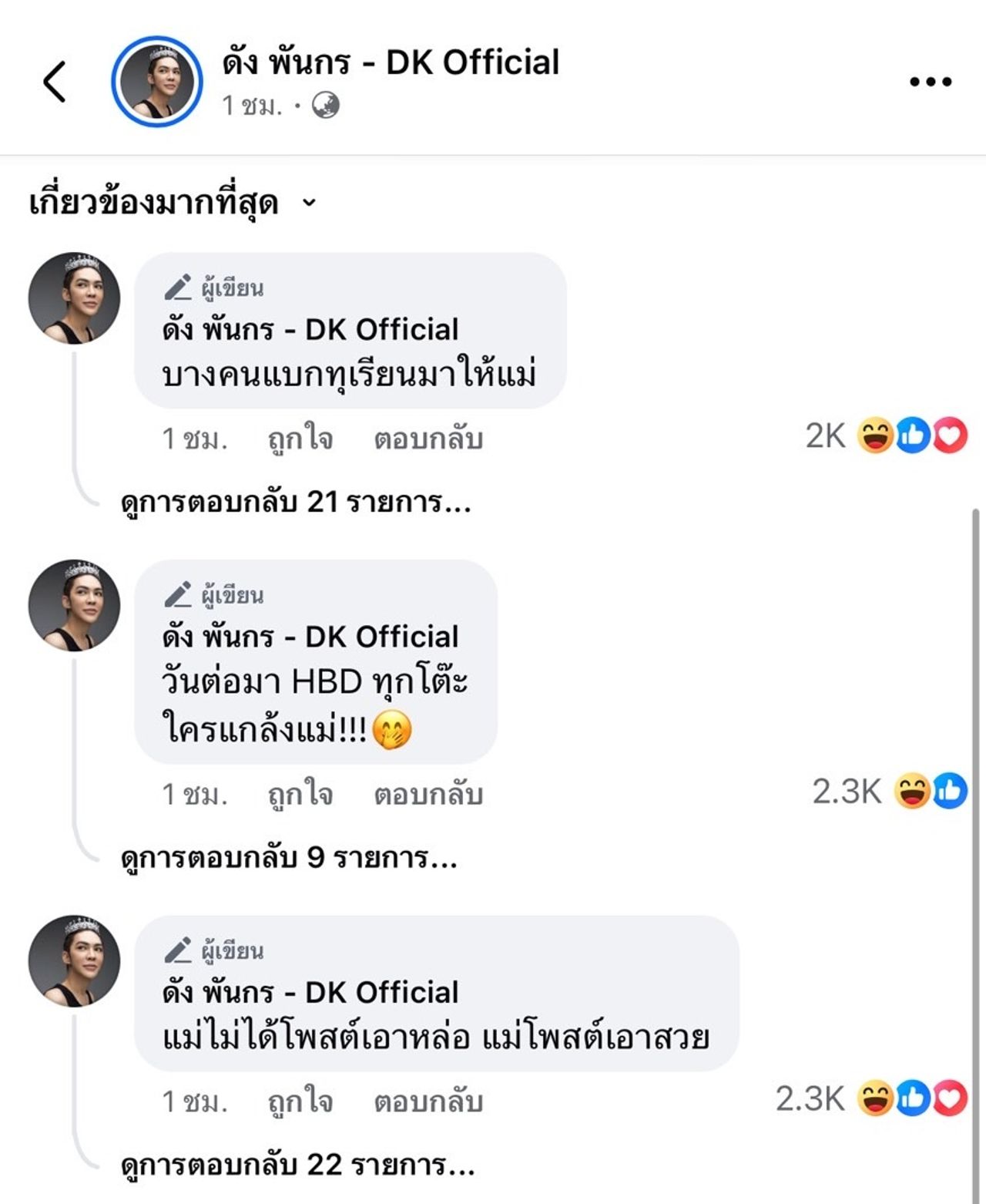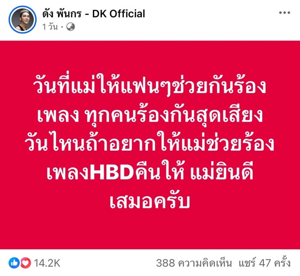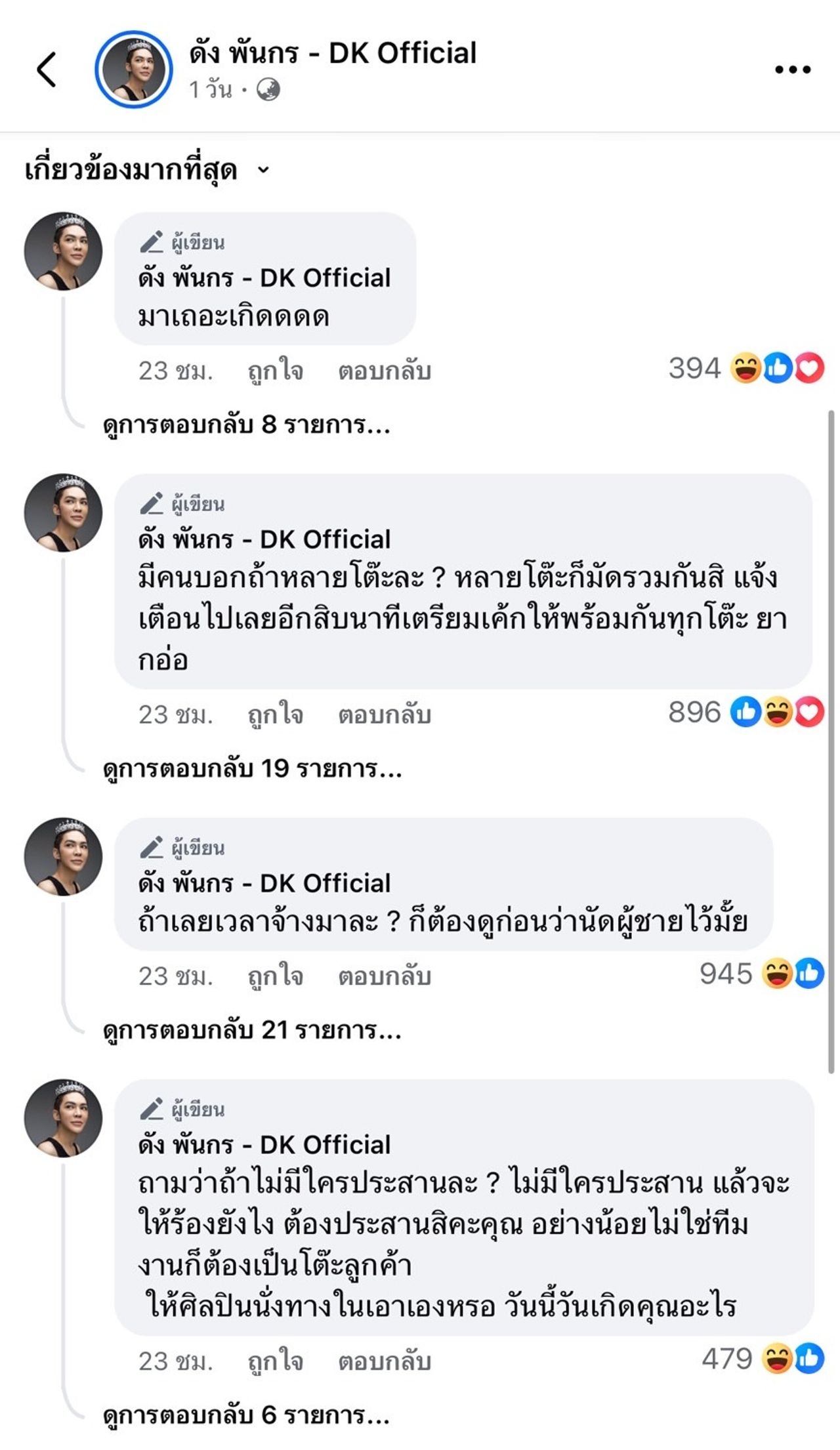 อีกทั้งยังโพสต์ข้อความเพิ่มเติมว่า “สละเวลาก้มไปรับทิป รับดอกไม้ รับของฝากจากเขาได้ ทำไมแม่จะสละเวลาร้องเพลง HBD ที่ใช้เวลาแค่สองสามนาทีให้เขาไม่ได้” พร้อมทั้งคอมเมนต์เพิ่มเติม อาทิ บางคนแบกทุเรียนมาให้แม่, วันต่อมา HBD ทุกโต๊ะ ใครแกล้งแม่!!!, แม่ไม่ได้โพสต์เอาหล่อ แม่โพสต์เอาสวย