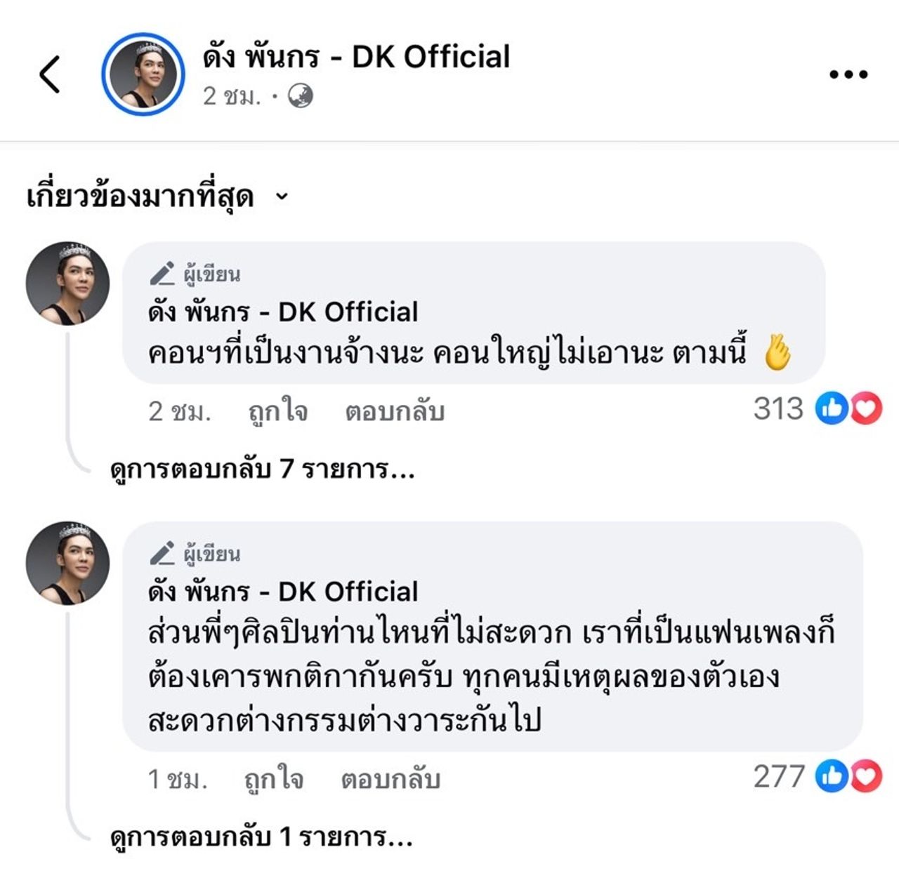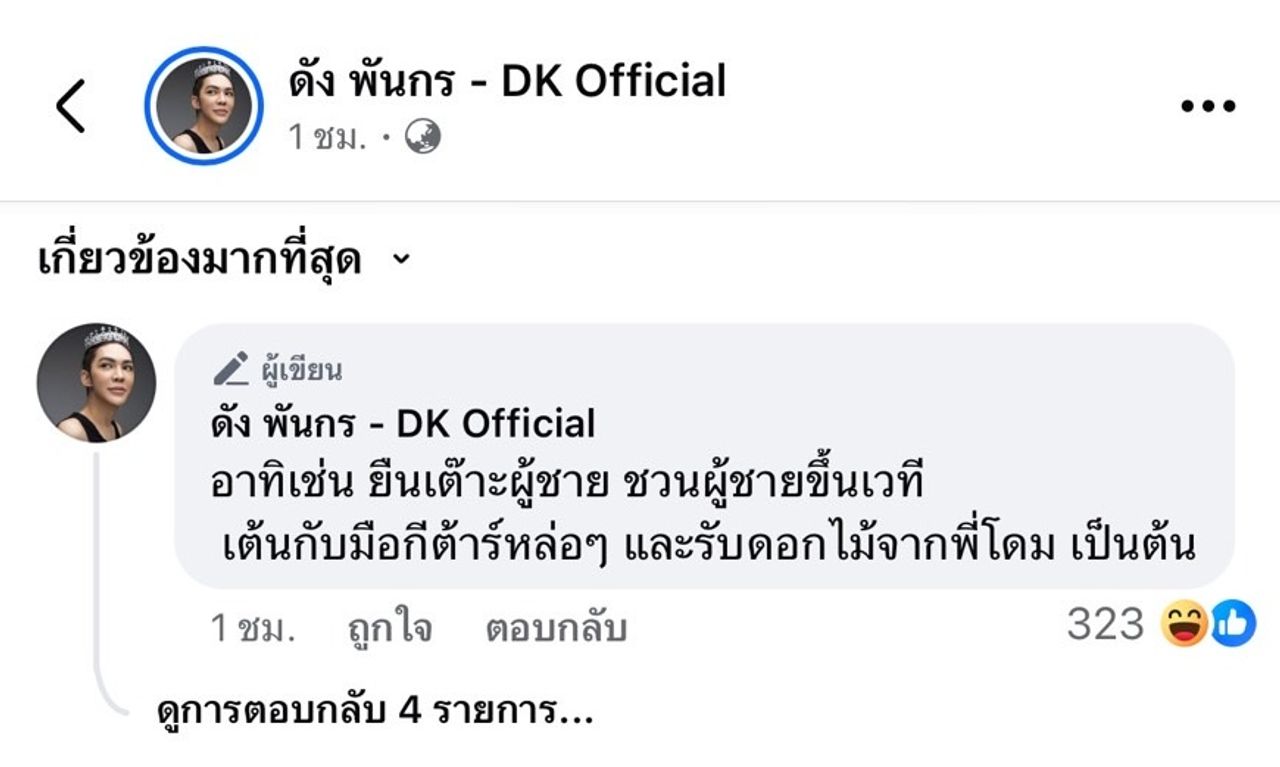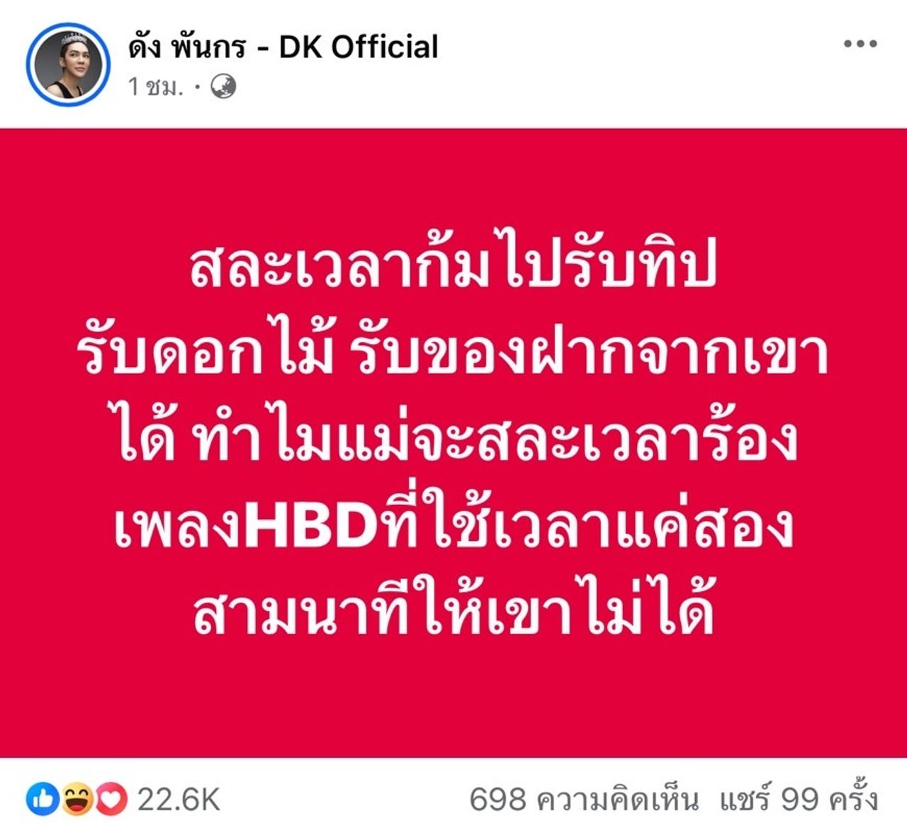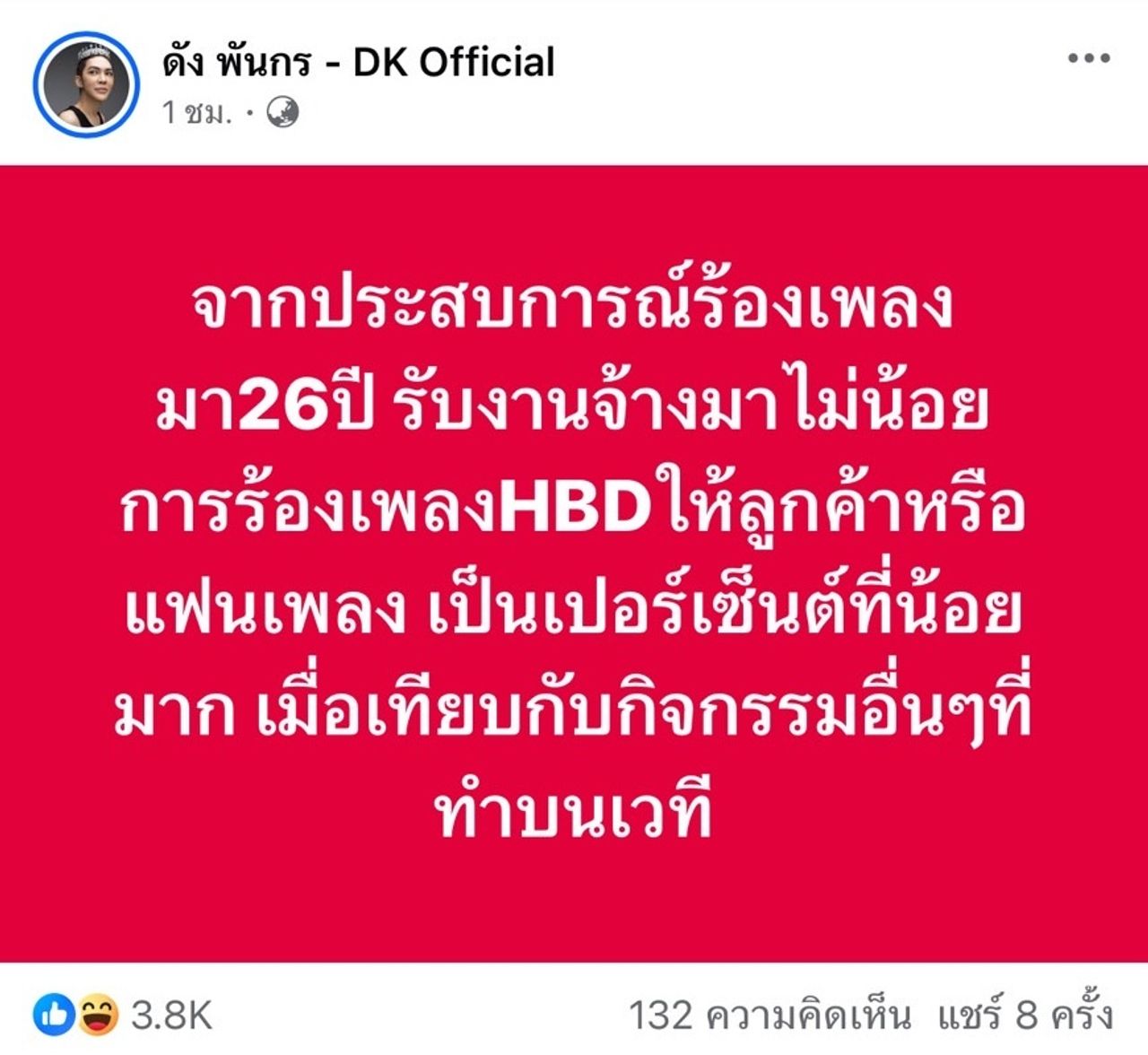 หลังจากนั้น ดัง พันกร ก็โพสต์อีกว่า “จากประสบการณ์ร้องเพลงมา 26 ปี รับงานจ้างมาไม่น้อย การร้องเพลง HBD ให้ลูกค้าหรือแฟนเพลง เป็นเปอร์เซ็นต์ที่น้อยมาก เมื่อเทียบกับกิจกรรมอื่นๆ ที่ทำบนเวที” และคอมเมนต์ติดตลกใต้โพสต์ว่า “อาทิเช่น ยืนเต๊าะผู้ชาย ชวนผู้ชายขึ้นเวที เต้นกับมือกีต้าร์หล่อๆ และรับดอกไม้จากพี่โดม เป็นต้น”