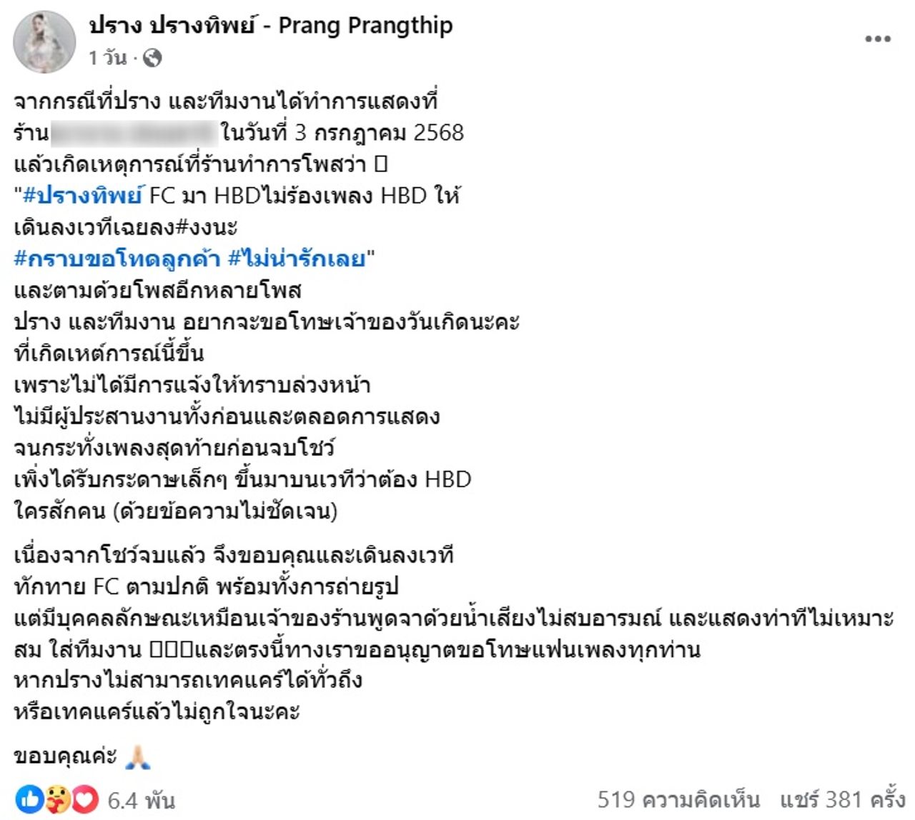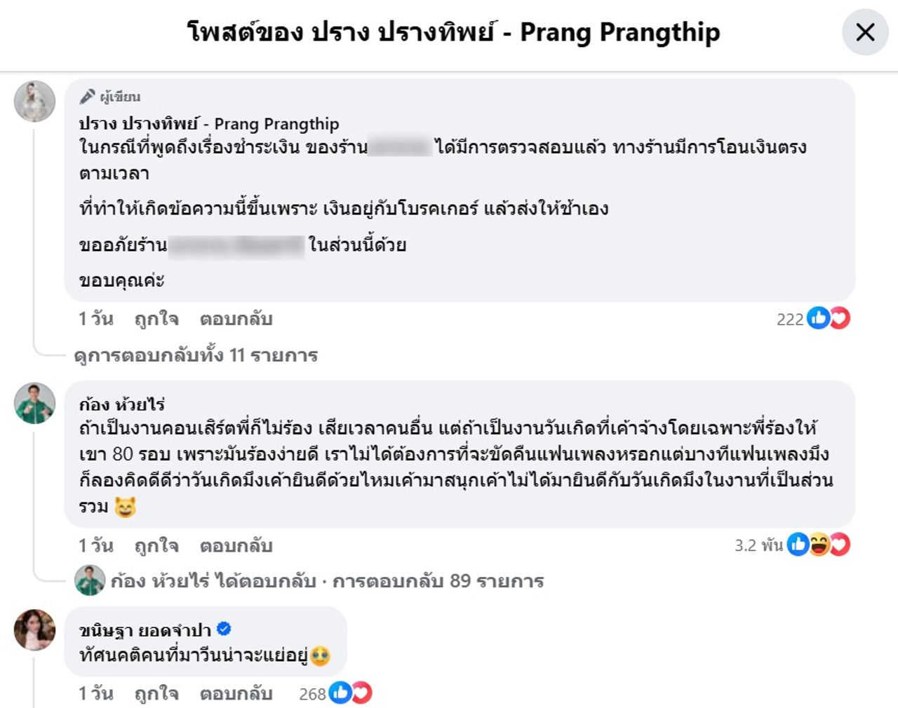 จากกรณีที่นักร้องสาว ปราง ปรางทิพย์ เจอกระแสดราม่าจากร้านที่จ้างไปเล่นคอนเสิร์ตว่าไม่ร้องเพลง Happy Birthday ให้กับลูกค้าที่ร้าน ทำให้เกิดการวิพากษ์วิจารณ์ ก่อนที่ปรางจะโพสต์ข้อความชี้แจงถึงเรื่องที่เกิดขึ้นและขอโทษ ในขณะที่ ก้อง ห้วยไร่ ก็คอมเมนต์ถึงเรื่องนี้ว่าเป็นตนก็ไม่ร้อง เพราะเสียเวลาคนอื่น แต่ถ้าเป็นงานวันเกิดที่เค้าจ้างโดยเฉพาะก็จะร้องให้เขา 80 รอบ และบอกว่าวันเกิดมึx เค้ายินดีด้วยไหม เค้ามาสนุก เค้าไม่ได้มายินดีกับวันเกิดมึxในงานที่เป็นส่วนรวม