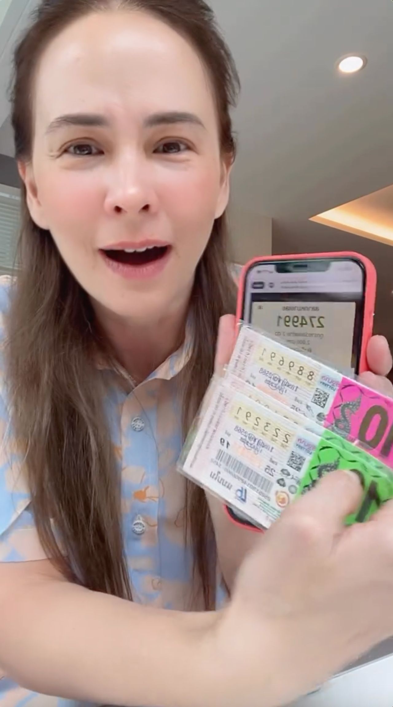 โดยในคลิปที่แอนลง เจ้าตัวนั้นดีใจสุดๆ ที่ตัวเองถูกลอตเตอรี่รางวัลเลขท้าย 2 ตัว 30 ใบ ก่อนจะเล่าว่า “ทุกคน มันมหัศจรรย์มาก แม่ไปงานบวชสามเณรีเจนี่ กำลังจะกลับบ้านอยู่แล้วนะ มีคนท้องเดินมาบอก คุณแอนๆ คนท้องอยากให้โชค แอนก็เลยเดินหันหลังกลับไป เขามีหลายชุดมาก เลยถามงั้นซื้อเลขอะไรดี