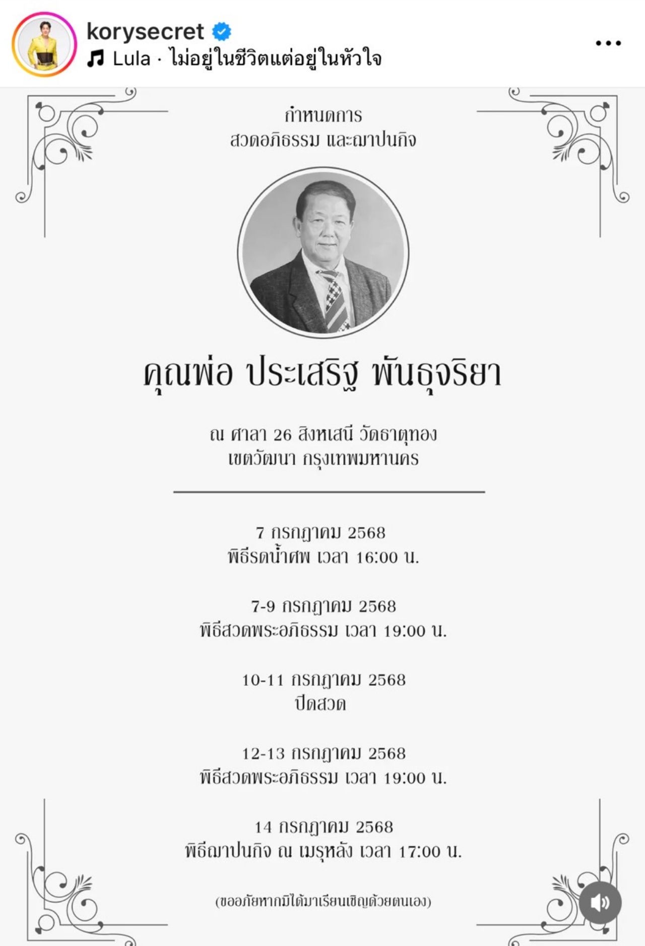 โดยเจ้าตัวได้โพสต์แจ้งข่าวเศร้า พร้อมข้อความอาลัยว่า "ถึงแม้ว่าเราไม่ได้เกิดมาพร้อมกัน แต่เราก็มาส่งป๊าพร้อมกันทุกคนนะ การเดินทางบทใหม่เริ่มต้นขึ้นแล้ว love you forever my Dad ประเสริฐ พันธุจริยา #koryfamily"