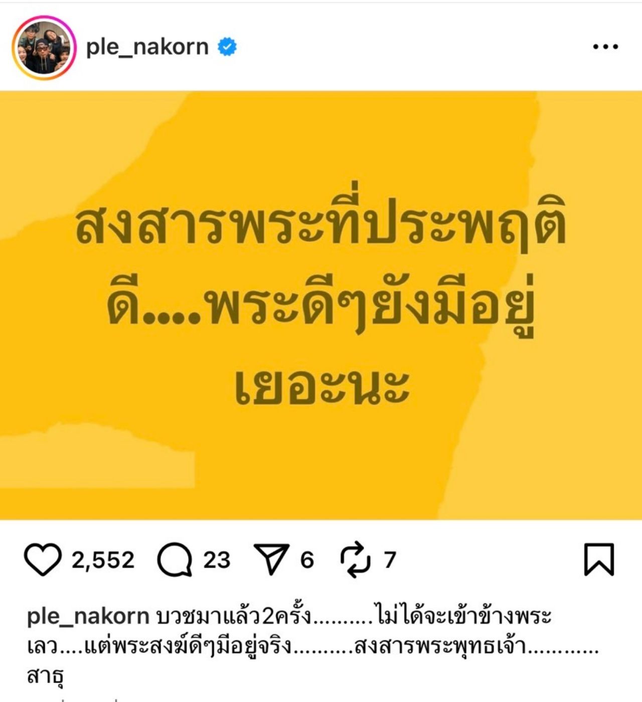 ล่าสุด เปิ้ล นาคร ได้ออกมาโพสต์ข้อความผ่านอินสตาแกรม แสดงความคิดเห็นถึงประเด็นนี้บอกว่า "สงสารพระที่ประพฤติดี...พระดีๆ ยังมีอยู่เยอะนะ" และเขียนแคปชั่นว่า "บวชมาแล้ว 2 ครั้ง ไม่ได้จะเข้าข้างพระเลว แต่พระสงฆ์ดีๆ มีอยู่จริง สงสารพระพุทธเจ้า สาธุ"