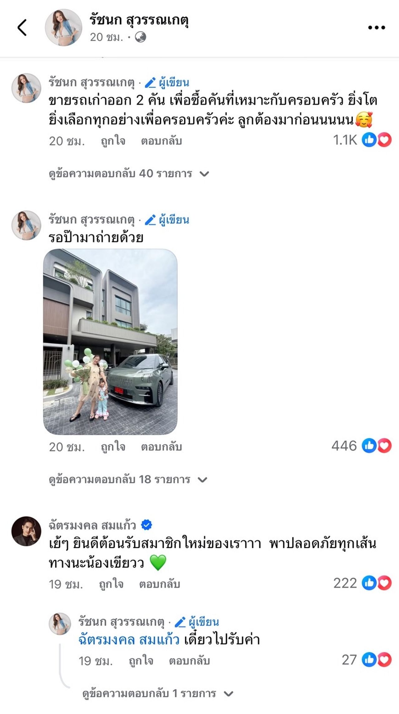 อีกทั้งยังคอมเมนต์เพิ่มเติมใต้ภาพไว้ว่า “ขายรถเก่าออก 2 คัน เพื่อซื้อคันที่่เหมาะกับครอบครัว ยิ่งโต ยิ่งเลือกทุกอย่างเพื่อครอบครัวค่ะ ลูกต้องมาก่อนนนนน” ด้าน ยิว ฉัตรมงคล สมแก้ว สามีของเจนนี่ ก็เข้ามาคอมเมนต์ว่า “เย้ๆ ยินดีต้อนรับสมาชิกใหม่ของเราาา พาปลอดภัยทุกเส้นทางนะน้องเขียวว” และยังมีคนในวงการบันเทิงรวมถึงแฟนๆ ร่วมแสดงความยินดีมากมาย