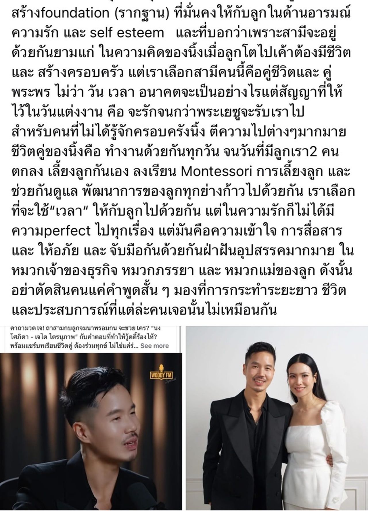 แต่ในความรักก็ไม่ได้มีความ perfect ไปทุกเรื่อง แต่มันคือความเข้าใจ การสื่อสาร และให้อภัย และจับมือกันด้วยกันฝ่าฟันอุปสรรคมากมาย ในหมวกเจ้าของธุรกิจ หมวกภรรยา และหมวกแม่ของลูก ดังนั้นอย่าตัดสินคนแค่คำพูดสั้นๆ มองที่การกระทำระยะยาว ชีวิตและประสบการณ์ที่แต่ละคนเจอนั้นไม่เหมือนกัน"