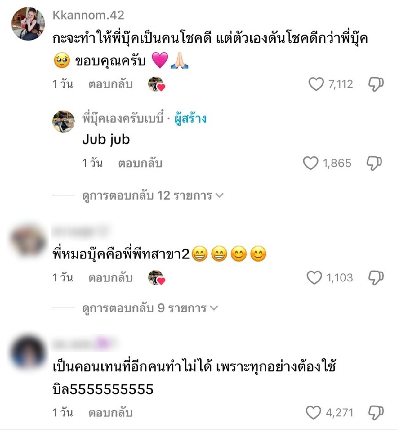 ซึ่งหลังจากหมอบุ๊คโพสต์คลิปลง TikTok ขนมก็เข้ามาคอมเมนต์ว่า “กะจะทำให้พี่บุ๊คเป็นคนโชคดี แต่ตัวเองดันโชคดีกว่าพี่บุ๊ค ขอบคุณครับ” ก่อนที่หมอบุ๊คจะตอบกลับไปว่า “Jub jub” นอกจากนี้ก็มีแฟนๆ ต่างเข้ามาคอมเมนต์ชื่นชมความน่ารักของทั้งคู่ด้วย
