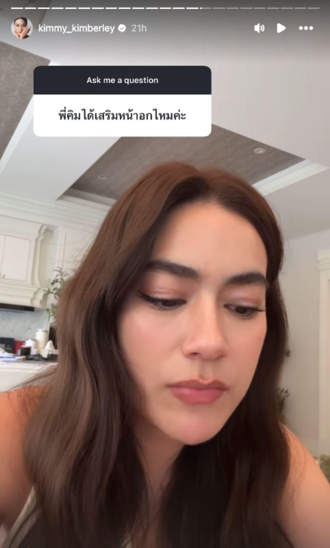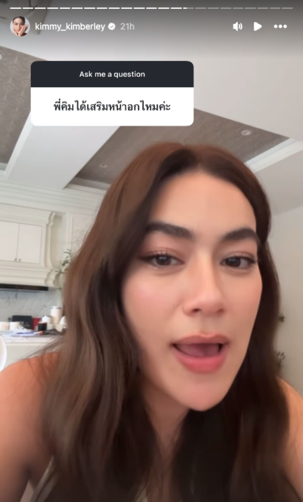 ล่าสุดได้มีแฟนคลับส่งคำถามเข้ามาถาม คิมเบอร์ลี่ ว่า "พี่คิมได้เสริมหน้าอกไหมคะ?" เจ้าตัวก็ได้ตอบกลับว่า "ไม่ได้เสริมค่ะ เพราะว่าคิดมาตลอดว่าตัวเองเป็นคนที่มีอยู่แล้ว ตั้งแต่เด็กๆ จะชอบแอบเขิน ไม่ชอบใส่เสื้อผ้าที่โป๊อะไรแบบนี้ แต่พอโตขึ้นมันหายไปไหนก็ไม่รู้อะ มันหายไปเลยจ้ะ"