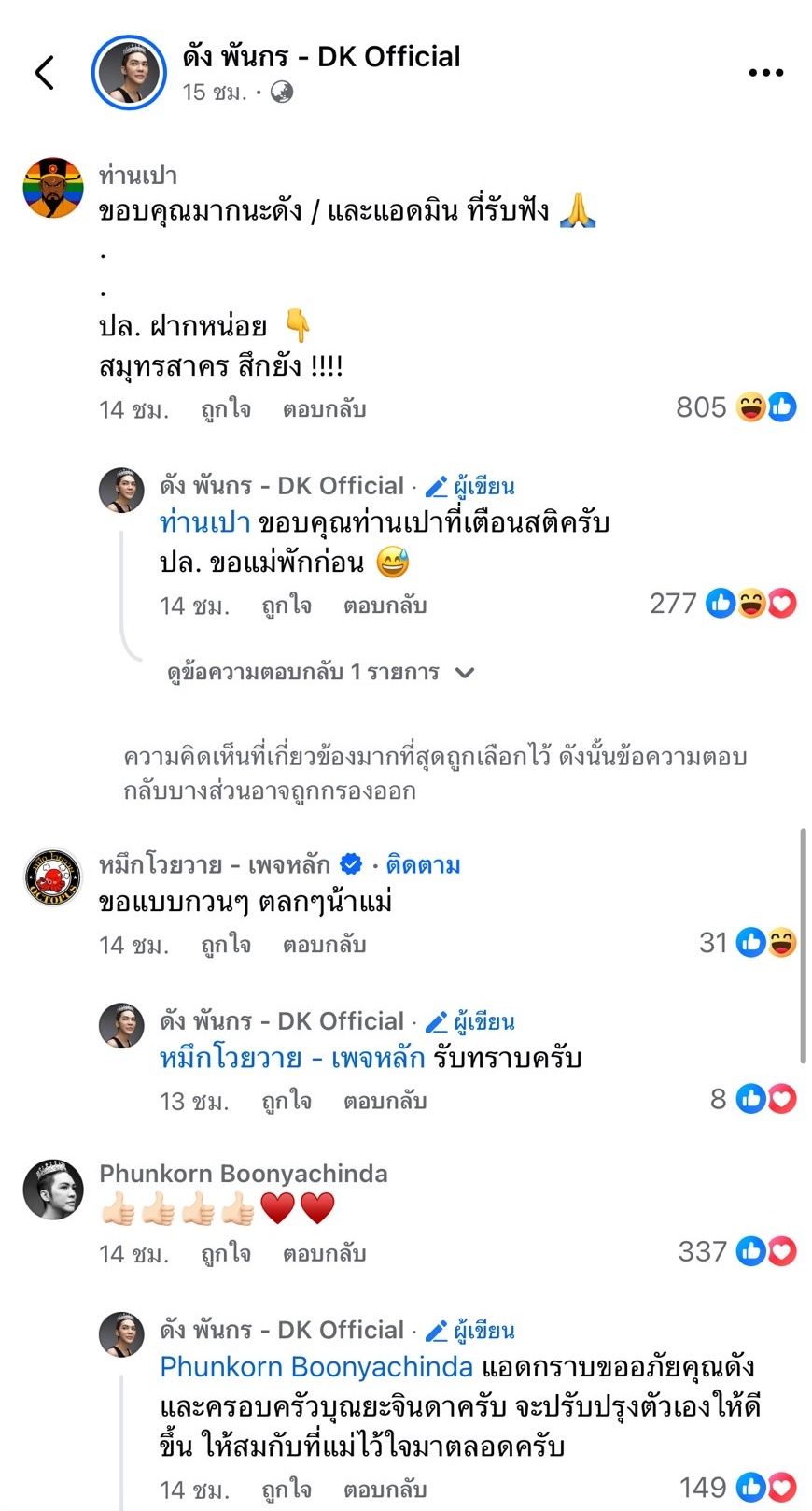 ในขณะที่ ดัง พันกร คอมเมนต์เป็นอีโมจิยกนิ้วให้และหัวใจ ซึ่งแอดมินก็ตอบกลับว่า “แอดกราบขออภัยคุณดังและครอบครัวบุณยะจินดาครับ จะปรับปรุงตัวเองให้ดีขึ้น ให้สมกับที่แม่ไว้ใจมาตลอดครับ”
