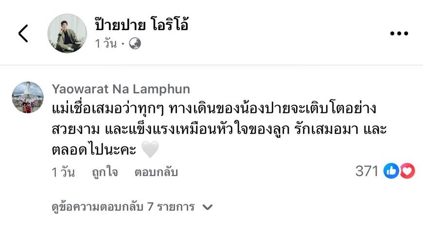 หลังจากนั้นก็มีแฟนๆ เข้ามาคอมเมนต์ให้กำลังใจ ป๊ายปาย โอริโอ้ กับเส้นทางชีวิตหลังจากนี้เป็นจำนวนมาก ในขณะที่อดีตผู้จัดการก็แสดงความคิดเห็นว่า “แม่เชื่อเสมอว่าทุกๆ ทางเดินของน้องปายจะเติบโตอย่างสวยงาม และแข็งแรงเหมือนหัวใจของลูก รักเสมอมา และตลอดไปนะคะ”