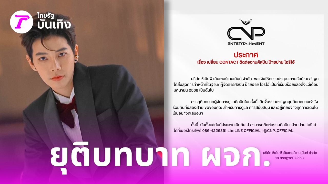 บริษัท ซีเอ็นพี เอ็นเตอร์เทนเม้นท์ จำกัด ขอแจ้งให้ทราบว่าคุณเยาวรัตน์ ณ ลำพูน ได้สิ้นสุดการทำหน้าที่ในฐานะ ผู้จัดการศิลปิน ป๊ายปาย โอริโอ้ เป็นที่เรียบร้อยแล้วตั้งแต่เดือน มิถุนายน 2568 เป็นต้นไป