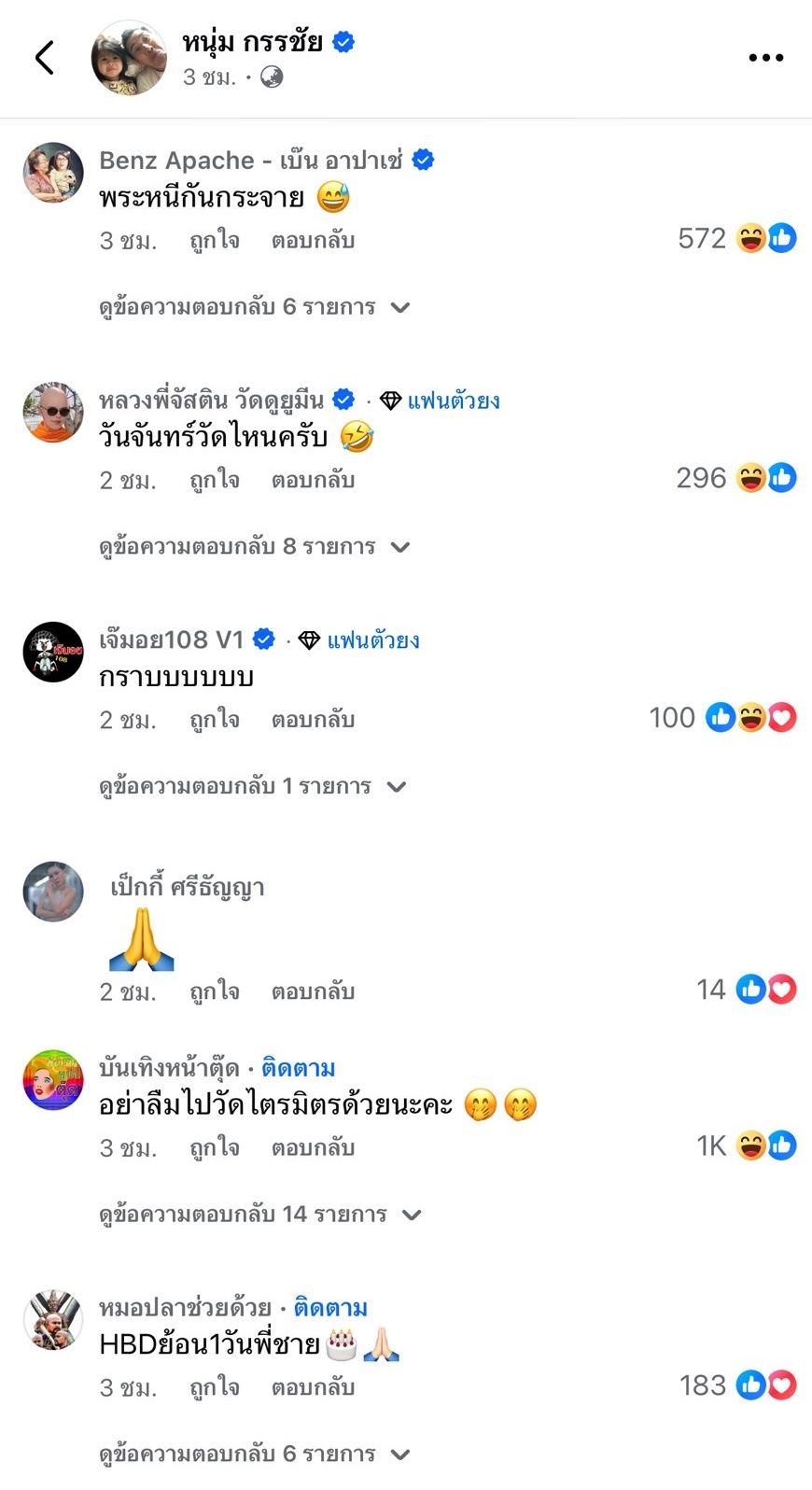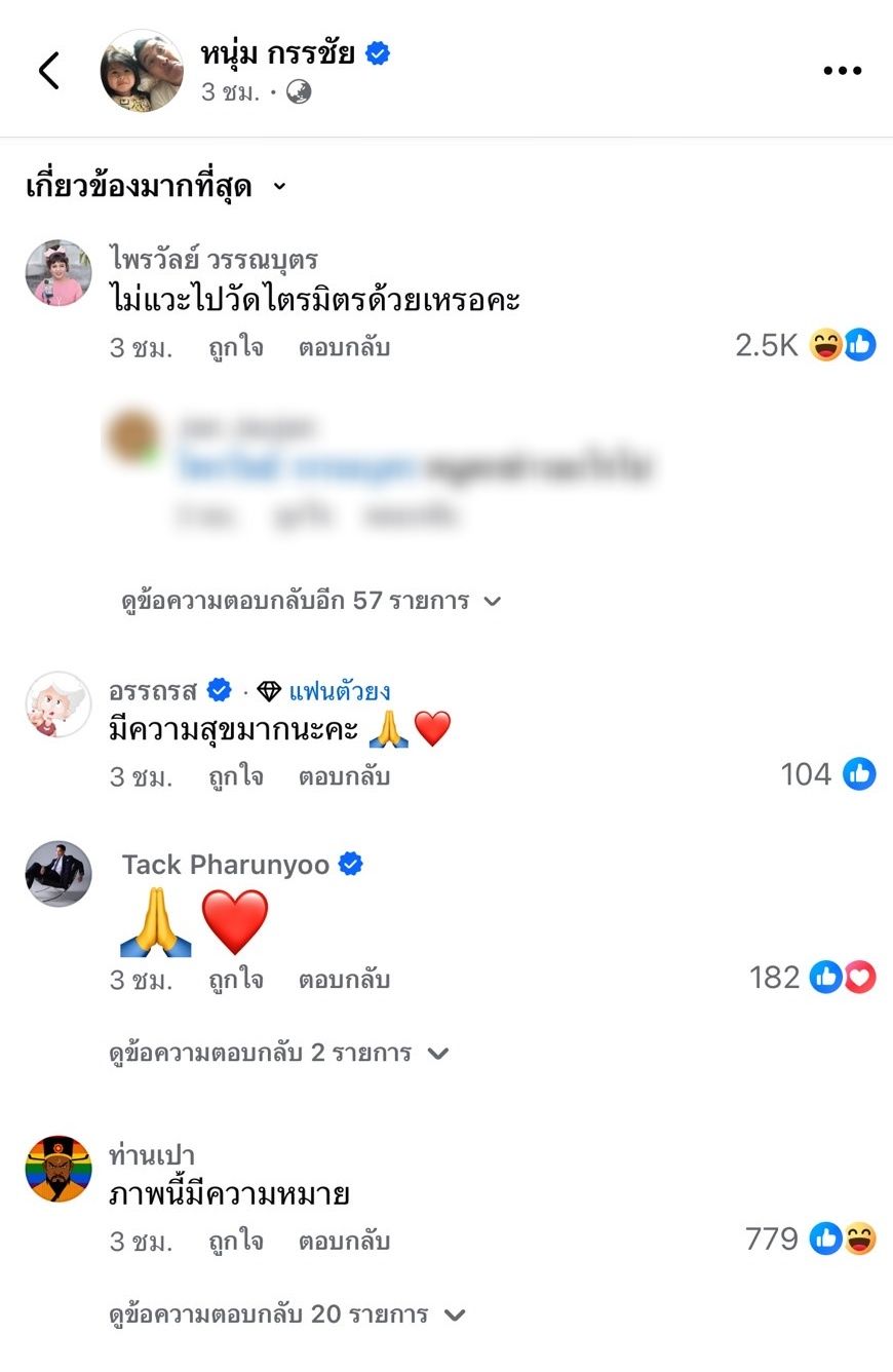 ส่องคอมเมนต์ก็มีแฟนๆ รวมถึงเพจต่างๆ แห่คอมเมนต์ อาทิ ภาพนี้มีความหมาย, วันจันทร์วัดไหนครับ, พระหนีกันกระจาย, กราบบบบบบ, อย่าลืมไปวัดไตรมิตรด้วยนะคะ, มีความสุขมากนะคะ, อนุโมทนาบุญด้วยค่ะ สาธุ ฯลฯ ในขณะที่ แพรรี่ ไพรวัลย์ คอมเมนต์ว่า “ไม่แวะไปวัดไตรมิตรด้วยเหรอคะ” และมีแฟนๆ กดไลก์พร้อมทั้งแสดงความคิดเห็นมากมาย