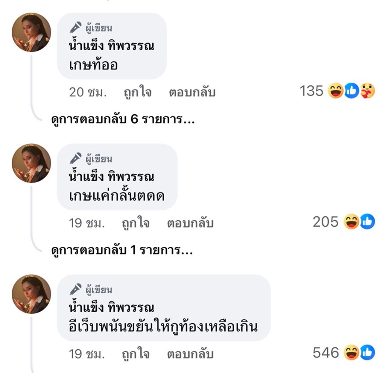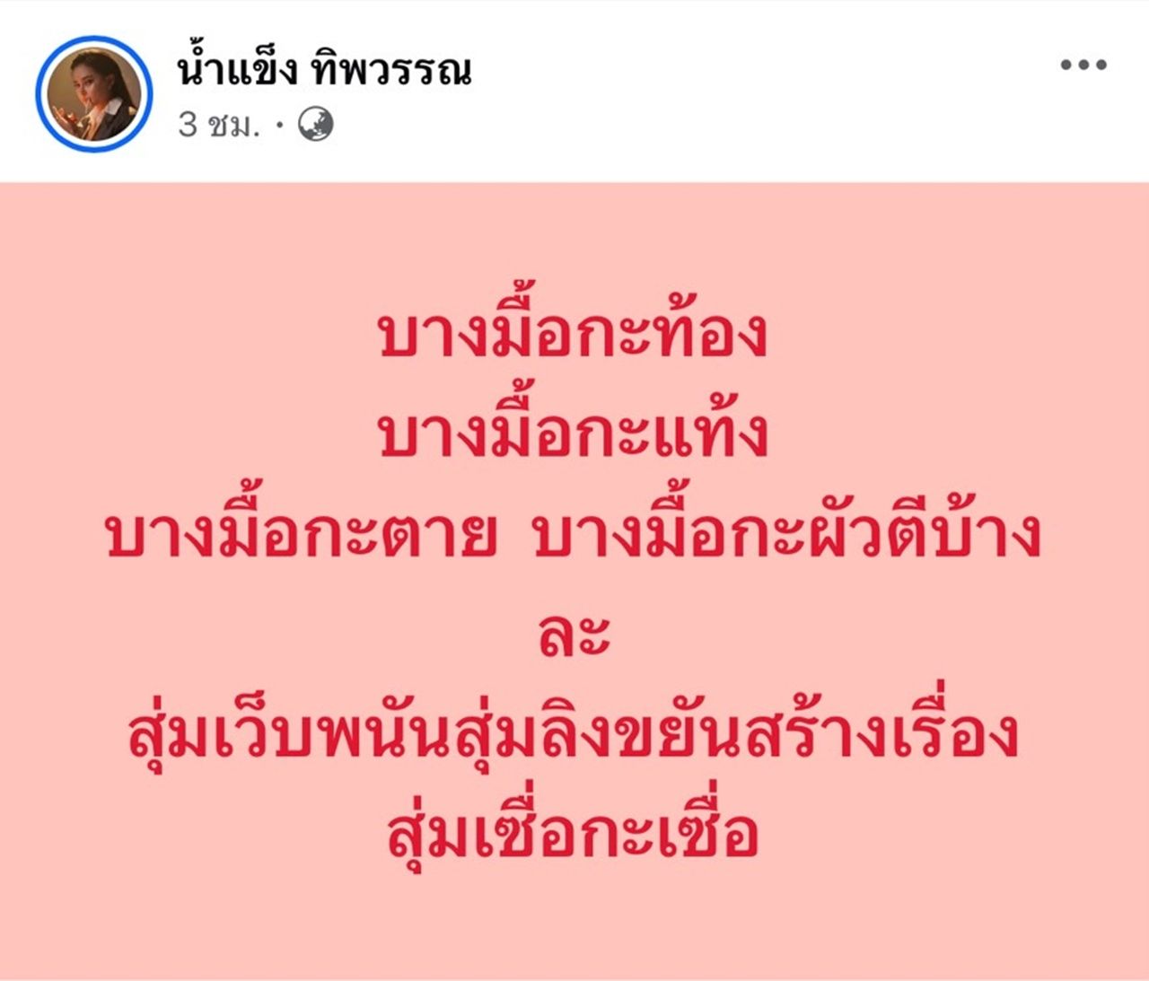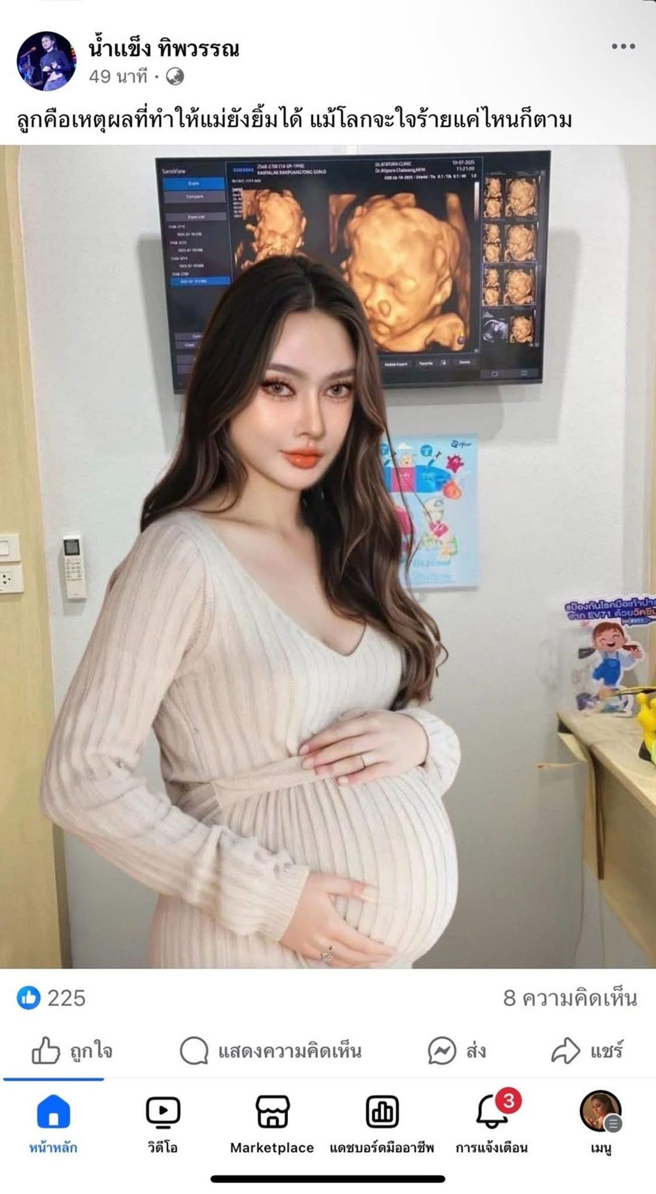 โดยเจ้าตัวได้นำภาพดังกล่าวมาโพสต์เขียนว่า "จ้าาา กูท้องกะใด่" และเขียนเพิ่มเติมในคอมเมนต์ว่า "อีเว็บพนันขยันให้กูท้องเหลือเกิน" นอกจากนี้ น้ำแข็ง ยังโพสต์เพิ่มเติมด้วยความเซ็งว่า "บางมื้อกะท้อง บางมื้อกะแท้ง บางมื้อกะตาย บางมื้อกะผัวตีบ้างละ สุ่มเว็บพนันสุ่มลิงขยันสร้างเรื่องสุ่มเซื่อกะเซื่อ" เพราะที่ผ่านมาเธอมักจะโดนมือดีเอาไปตัดต่อภาพว่ากำลังท้องแก่ใกล้คลอดมาหลายครั้งแล้ว แถมยังสร้างเฟคนิวส์ขึ้นมาอีกด้วย จนมีคนหลงเชื่อไปหลายคนแล้ว