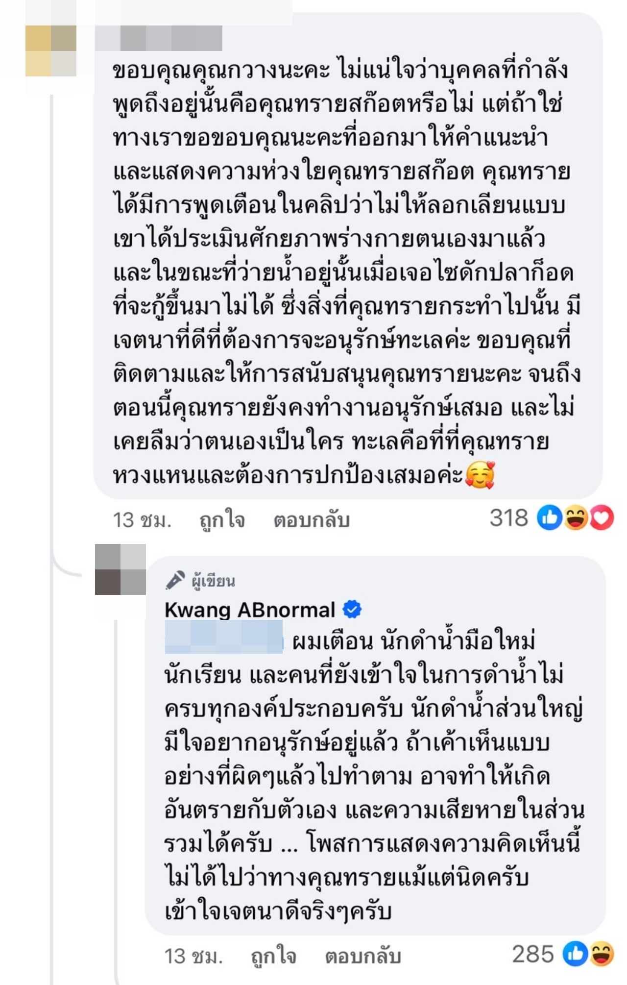 - ด้าน กวาง ก็ได้ตอบกลับว่า "ผมเตือน นักดำน้ำมือใหม่ นักเรียน และคนที่ยังเข้าใจในการดำน้ำไม่ครบทุกองค์ประกอบครับ นักดำน้ำส่วนใหญ่มีใจอยากอนุรักษ์อยู่แล้ว ถ้าเขาเห็นแบบอย่างที่ผิดๆแล้วไปทำตาม อาจทำให้เกิดอันตรายกับตัวเอง และความเสียหายในส่วนรวมได้ครับ … โพสต์การแสดงความคิดเห็นนี้ ไม่ได้ไปว่าทางคุณทรายแม้แต่นิดครับ เข้าใจเจตนาดีจริงๆครับ"