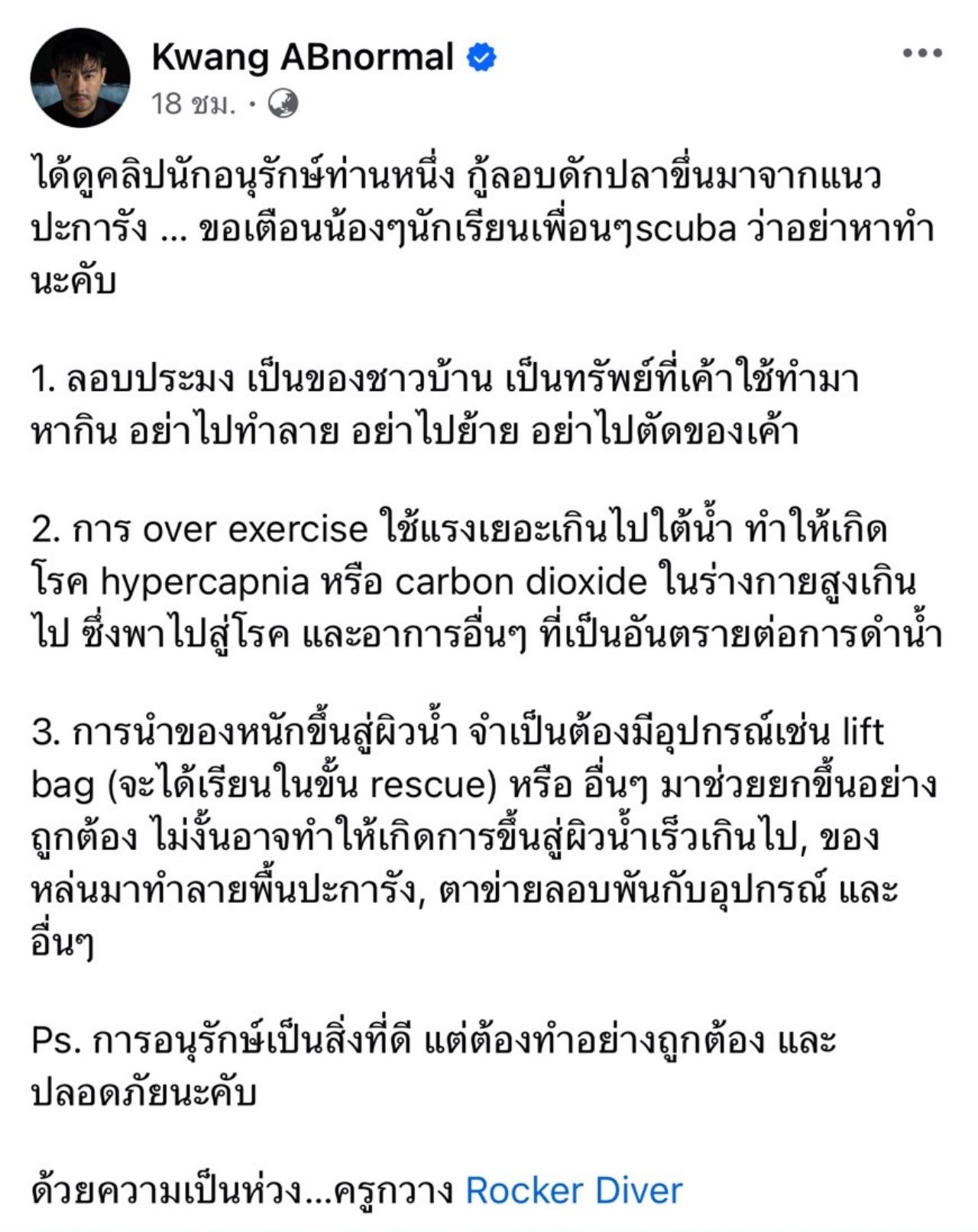หลังจากที่ กวาง AB Normal หรือ กวาง ศิริศิลป์ โชติวิจิตร ได้ออกมาโพสต์ถึงนักอนุรักษ์คนหนึ่ง ที่ได้กู้ลอบดักปลาขึ้นมาจากแนวปะการัง พร้อมกับเตือนนักดำน้ำว่า อย่าหาทำ โดย กวาง ได้เขียนข้อความว่า