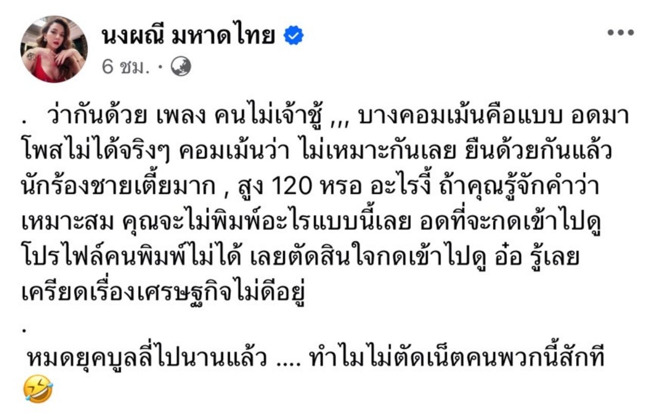 "ว่ากันด้วย เพลง คนไม่เจ้าชู้ ,,, บางคอมเมนต์คือแบบ อดมาโพสต์ไม่ได้จริงๆ คอมเมนต์ว่า ไม่เหมาะกันเลย ยืนด้วยกันแล้วนักร้องชายเตี้ยมาก , สูง 120 หรือ อะไรงี้ ถ้าคุณรู้จักคำว่าเหมาะสม คุณจะไม่พิมพ์อะไรแบบนี้เลย อดที่จะกดเข้าไปดูโปรไฟล์คนพิมพ์ไม่ได้ เลยตัดสินใจกดเข้าไปดู อ๋อ รู้เลย เครียดเรื่องเศรษฐกิจไม่ดีอยู่ หมดยุคบูลลี่ไปนานแล้ว …. ทำไมไม่ตัดเน็ตคนพวกนี้สักที"