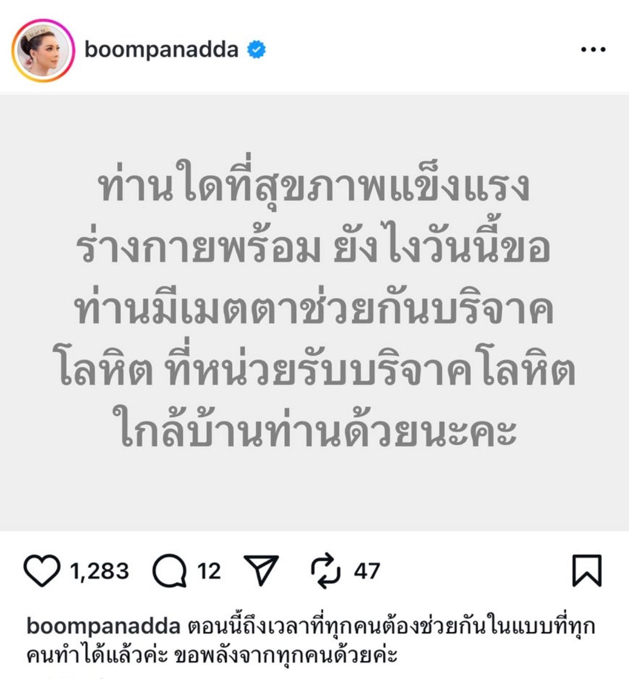 "ท่านใดที่สุขภาพแข็งแรงร่างกายพร้อม ยังไงวันนี้ขอท่านมีเมตตาช่วยกันบริจาคโลหิต ที่หน่วยรับบริจาคโลหิตใกล้บ้านท่านด้วยนะคะ ตอนนี้ถึงเวลาที่ทุกคนต้องช่วยกันในแบบที่ทุกคนทำได้แล้วค่ะ ขอพลังจากทุกคนด้วยค่ะ"
