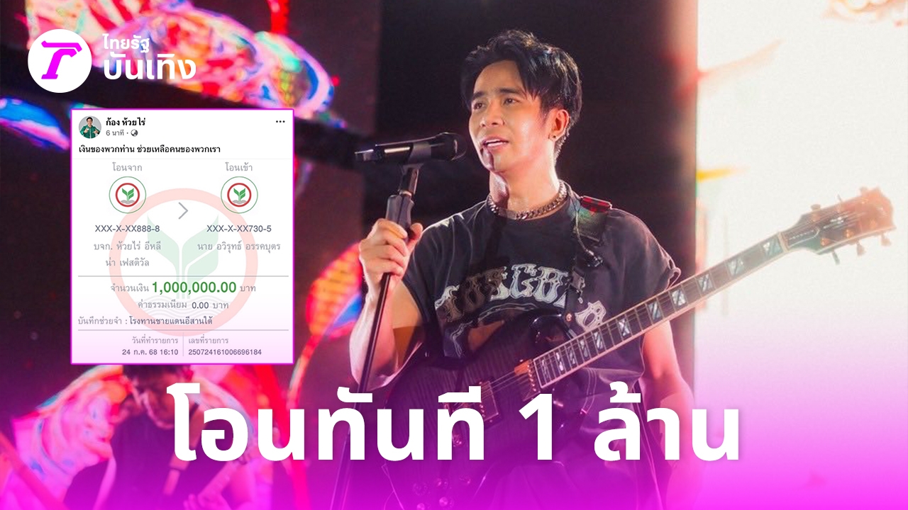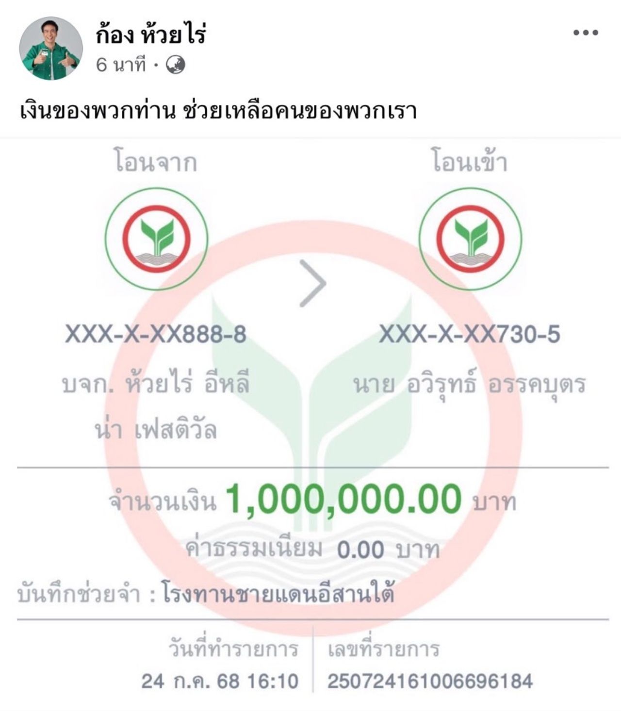 โดยเจ้าตัวได้โพสต์ข้อความว่า "ห้วยไร่ อีหลีน่า festival มอบ 1,000,000 บาท ทำโรงทาน ผู้อพยพชายแดนอีสานใต้" จากนั้นได้โพสต์ภาพสลิปโอนเงินแบบสดๆ ร้อนๆ และเขียนข้อความว่า "เงินของพวกท่าน ช่วยเหลือคนของพวกเรา"