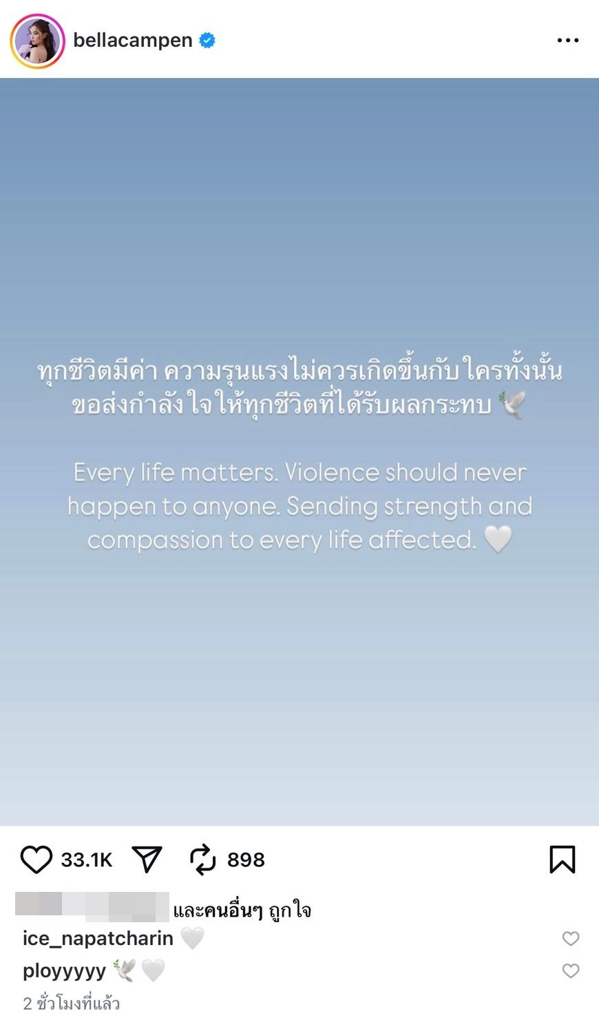 ซึ่งหลังจากที่มีการปะทะกันระหว่างแนวชายแดนไทย-กัมพูชา ด้านนางเอกสาวหน้าหวาน เบลล่า ราณี แคมเปน ก็ได้โพสต์ไอจีแสดงความคิดเห็นถึงประเด็นนี้ด้วยการโพสต์ภาพข้อความที่เขียนว่า “ทุกชีวิตมีค่า ความรุนแรงไม่ควรเกิดขึ้นกับใครทั้งนั้น ขอส่งกำลังใจให้ทุกชีวิตที่ได้รับผลกระทบ