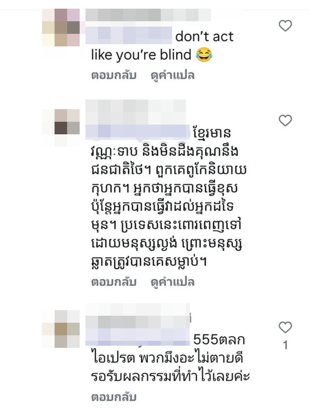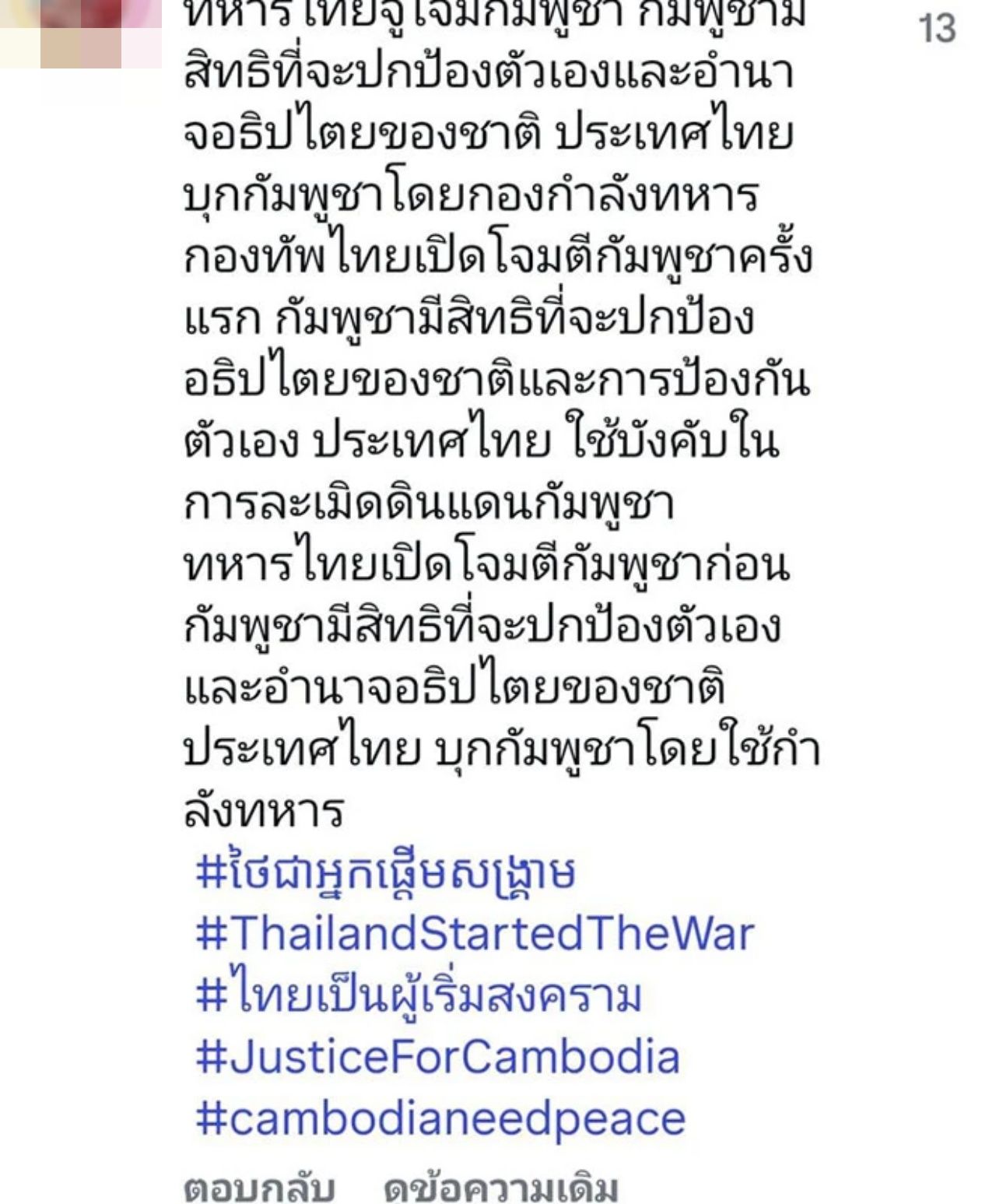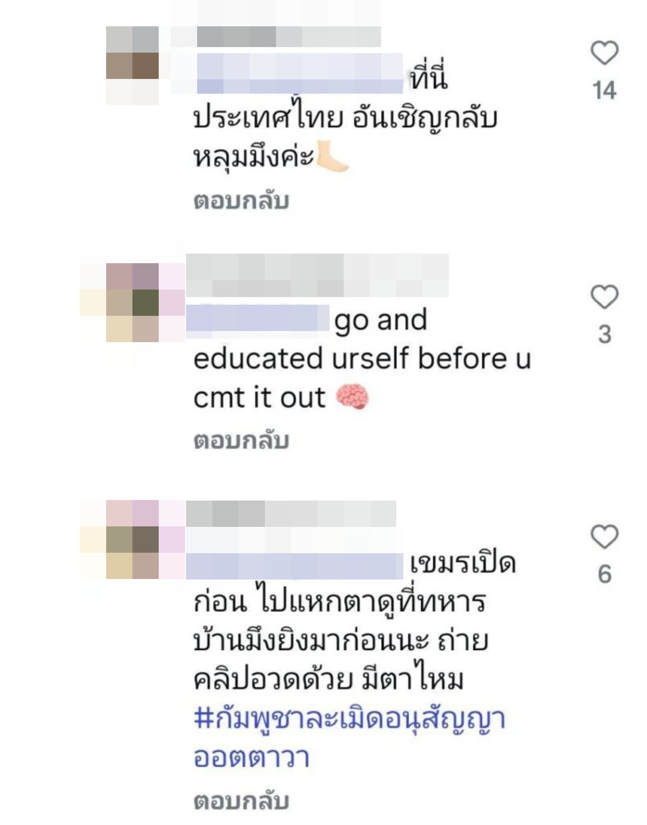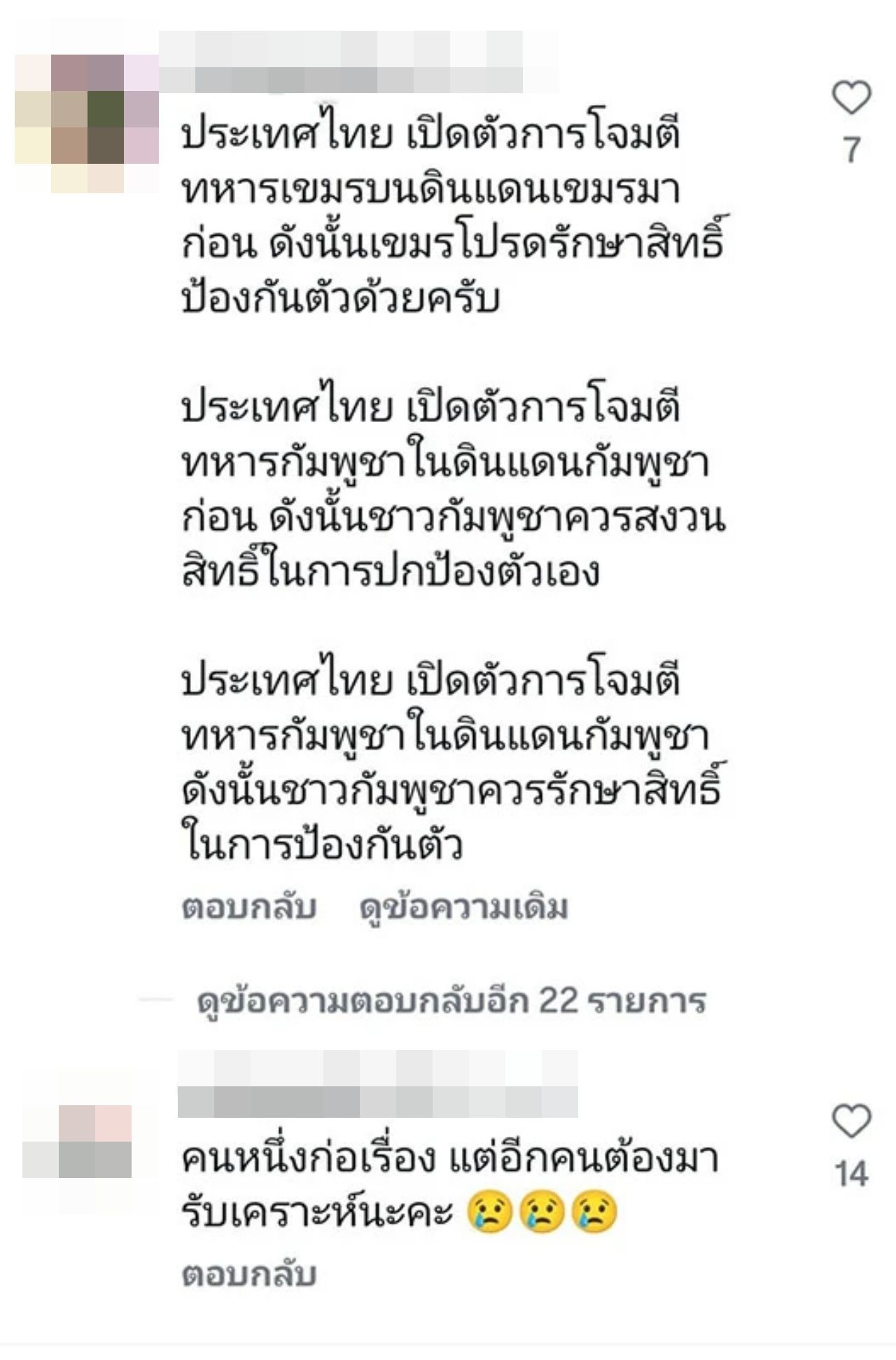 แต่งานนี้กลับเจอทัวร์กัมพูชาลง และเข้ามาคอมเมนต์กันจำนวนมาก โดยกล่าวหาว่าไทยเป็นฝ่ายเปิดฉากโจมตีกองทัพกัมพูชาก่อน ส่วนที่ตอบโต้ก็แค่ปกป้องประเทศเท่านั้น ทำเอาแฟนคลับของเบลล่าถึงกับเดือด โต้กลับทัวร์กัมพูชา ฟาดกันสนั่น พร้อมทั้งแนะให้เบลล่าปิดคอมเมนต์หรือลบโพสต์ออกไปเลย ซึ่งในเวลาต่อมา เบลล่า ก็ได้ปิดคอมเมนต์แล้ว
