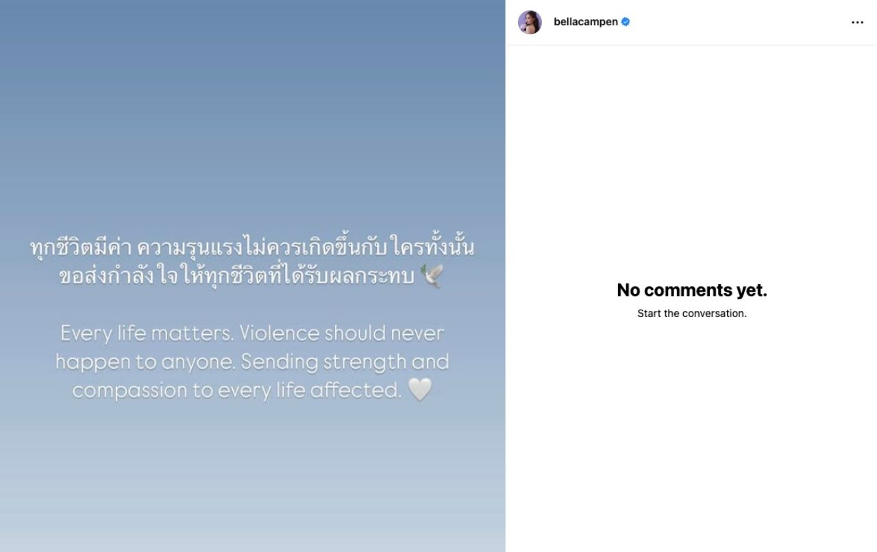 "ทุกชีวิตมีค่า ความรุนแรงไม่ควรเกิดขึ้นกับใครทั้งนั้นขอส่งกำลังใจให้ทุกชีวิตที่ได้รับผลกระทบ Every life matters. Violence should never happen to anyone. Sending strength and compassion to every life affected."