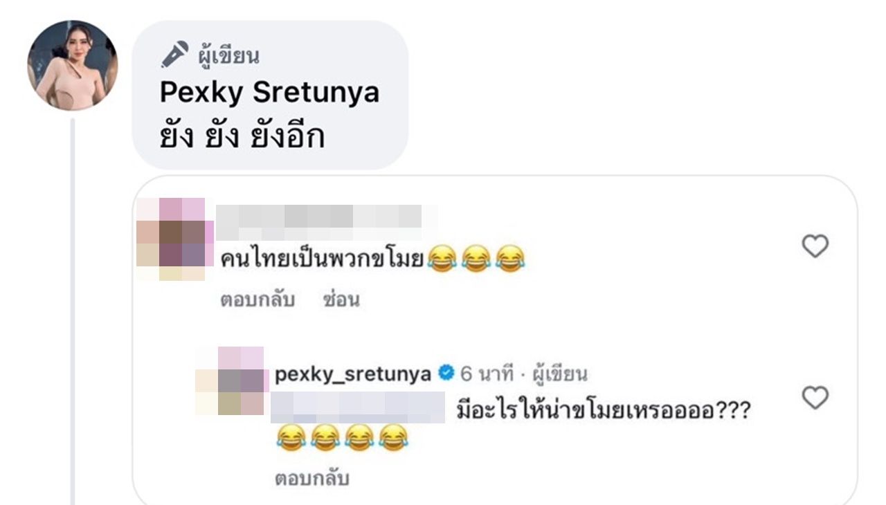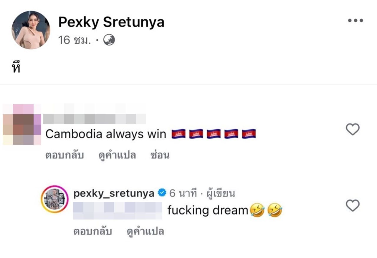 แต่งานนี้กลับมีชาวเน็ตของกัมพูชาเข้ามาคอมเมนต์เช่นกัน ด้านเป็กกี้ก็ไม่อยู่เฉย ตอกกลับทันที หลายคนที่เห็นข้อความตอกกลับของเป็กกี้ต่างเข้ามาบอกเป็นเสียงเดียวกันว่า ขอปรบมือให้เลย เป็นตัวแทนหมู่บ้านจริงๆ