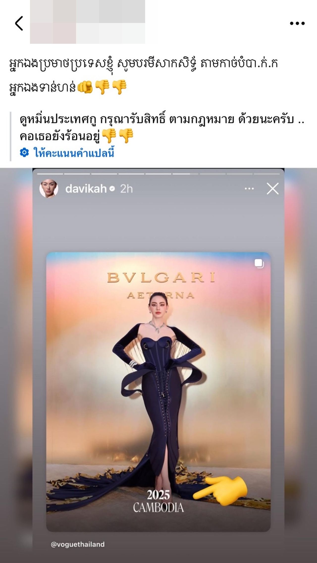 กลายเป็นดราม่าระอุที่ไม่มีใครคาดคิด เมื่อได้มีมือดีนำภาพของ ใหม่ ดาวิกา ที่เจ้าตัวเคยไปร่วมงานของ Bvlgari มาตัดต่อและใส่คำว่า "2025 Cambodia" ซึ่งคำดังกล่าวถูกจัดวางไว้บริเวณใต้เท้าของรูป และได้มีชาวเน็ตกัมพูชารายหนึ่ง นำภาพที่ถูกตัดต่อของ ใหม่ ดาวิกา มาโพสต์และตีความกันไปว่า ดูหมิ่นและจงใจเหยียบย่ำ ไม่ให้เกียรติกัมพูชา