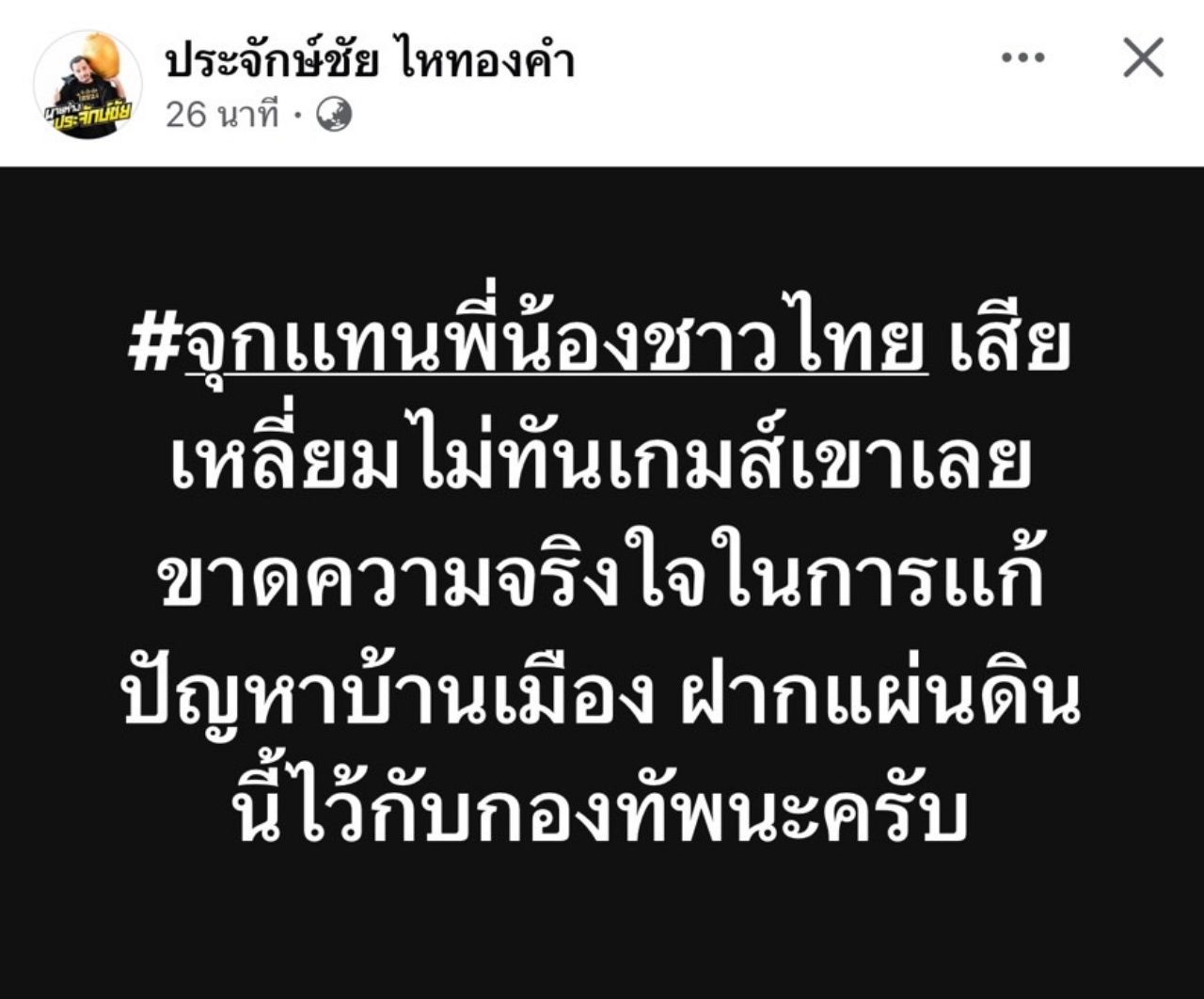 ระบุว่า"#จุกแทนพี่น้องชาวไทย เสียเหลี่ยมไม่ทันเกมส์เขาเลย ขาดความจริงใจในการแก้ปัญหาบ้านเมือง ฝากแผ่นดินนี้ไว้กับกองทัพนะครับ"
