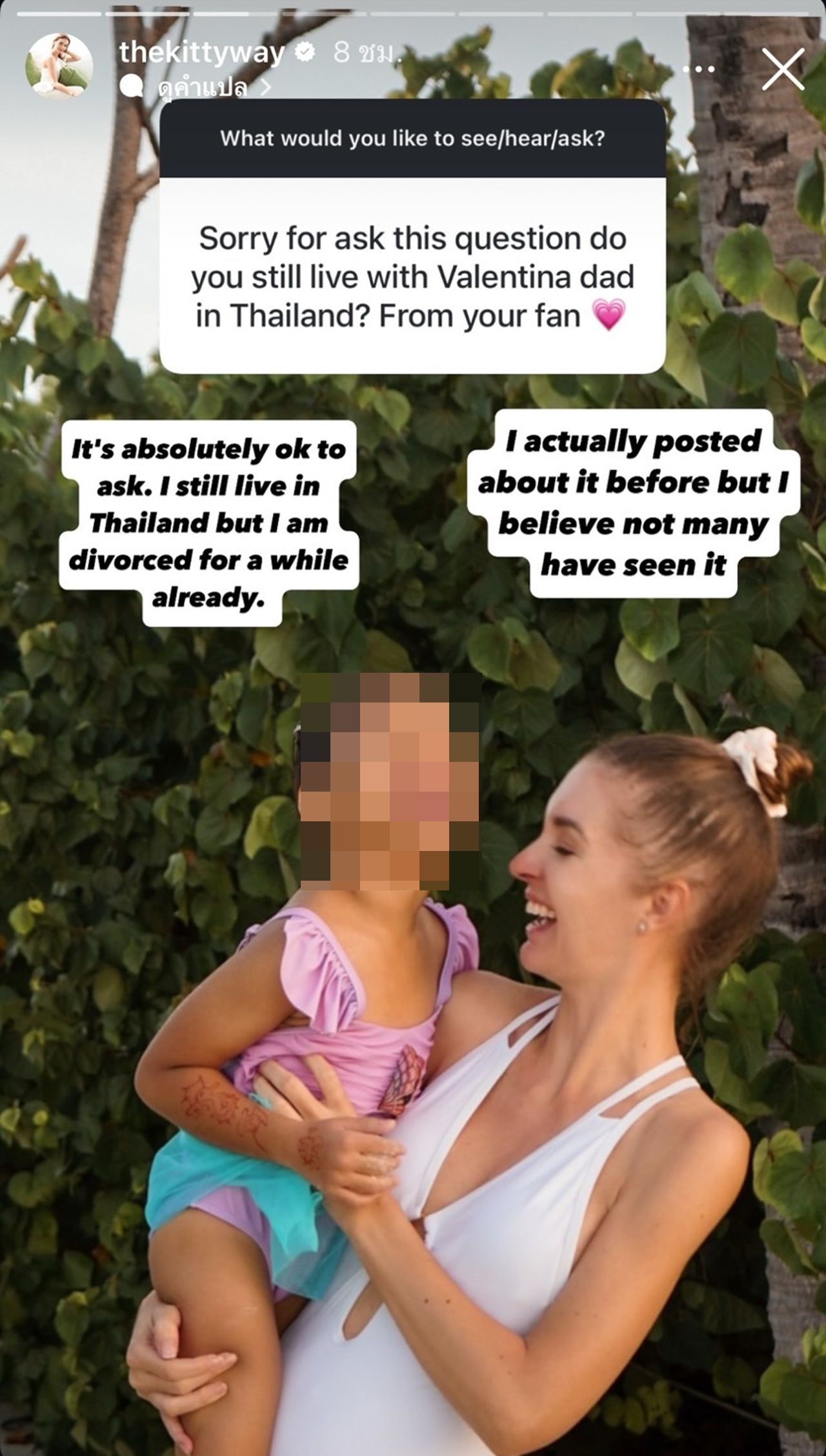 ด้าน คิตตี้ ได้ตอบกลับด้วยความยินดีว่า "ถามได้เลยค่ะ ฉันยังอยู่เมืองไทย แต่ฉันหย่ามาพักใหญ่แล้ว ฉันเคยโพสต์เกี่ยวกับเรื่องนี้มาก่อน แต่เหมือนจะไม่ค่อยมีคนเห็น"