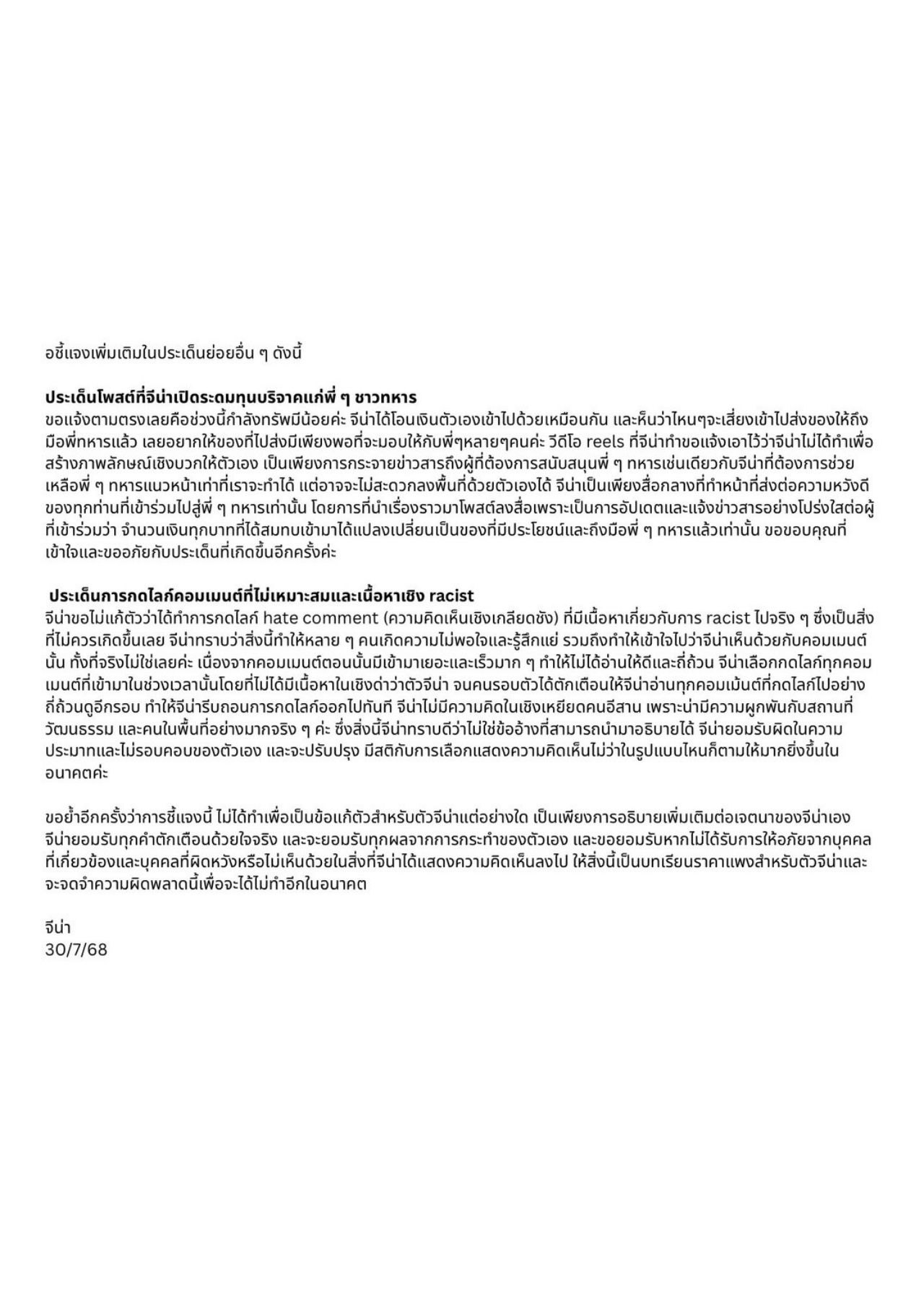 จีน่าเป็นเพียงสื่อกลางที่ทำหน้าที่ส่งต่อความหวังดีของทุกท่านที่เข้าร่วมไปสู่พี่ๆ ทหารเท่านั้น โดยการที่นำเรื่องราวมาโพสต์ลงสื่อ เพราะเป็นการอัปเดตและแจ้งข่าวสารอย่างโปร่งใสต่อผู้ที่เข้าร่วมว่า จำนวนเงินทุกบาทที่ได้สมทบเข้ามาได้แปลงเปลี่ยนเป็นของที่มีประโยชน์และถึงมือพี่ๆ ทหารแล้วเท่านั้น ขอขอบคุณที่เข้าใจและขออภัยกับประเด็นที่เกิดขึ้นอีกครั้งค่ะ