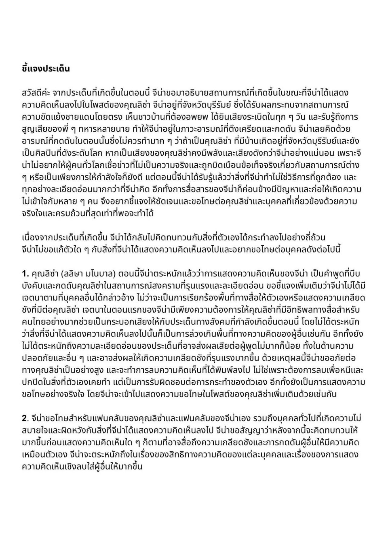 1. คุณลิซ่า (ลลิษา มโนบาล) ตอนนี้จีน่าตระหนักแล้วว่าการแสดงความคิดเห็นของจีน่า เป็นคำพูดที่บีบบังคับและกดดันคุณลิซ่าในสถานการณ์สงครามที่รุนแรงและละเอียดอ่อน ขอชี้แจงเพิ่มเติมว่าจีน่าไม่ได้มีเจตนาตามที่บุคคลอื่นได้กล่าวอ้าง