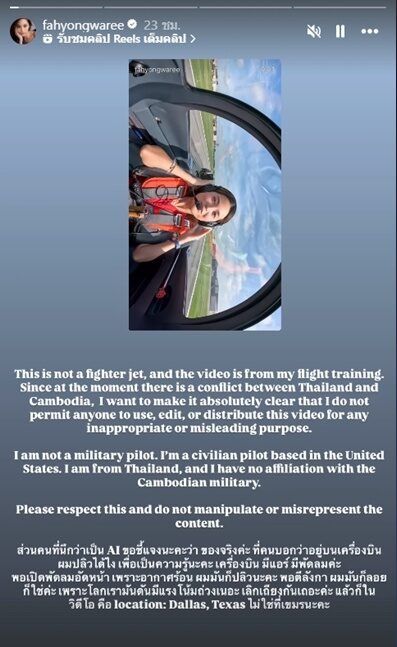 ล่าสุด ฟ้า ยงวรี โพสต์ชี้แจงถึงเรื่องคลิปขับเครื่องบินลงในไอจีสตอรี่เป็นภาษาอังกฤษ ซึ่งแปลความได้ว่า “นี่ไม่ใช่เครื่องบินรบ และวิดีโอนี้ถ่ายจากการฝึกบินของฉันเอง เนื่องจากตอนนี้มีความขัดแย้งระหว่างประเทศไทยและกัมพูชา