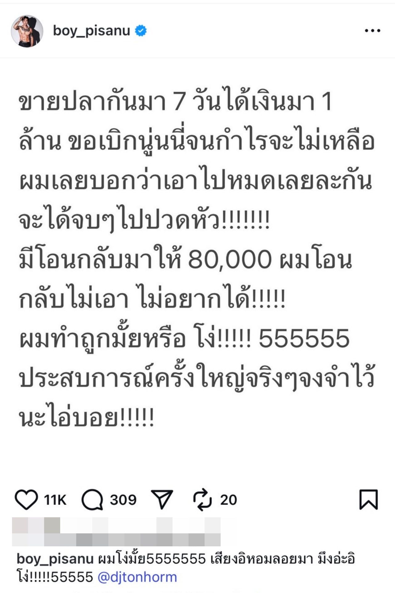 "ขายปลากันมา 7 วัน ได้เงินมา 1 ล้าน ขอเบิกนู่นนี่จนกำไรจะไม่เหลือ ผมเลยบอกว่า เอาไปหมดเลยละกันจะได้จบๆ ไป ปวดหัว!!!!!!! มีโอนกลับมาให้ 80,000 ผมโอนกลับไม่เอา ไม่อยากได้!!!!! ผมทำถูกมั้ยหรือโง่!!!!! 555555 ประสบการณ์ครั้งใหญ่จริงๆ จงจำไว้นะไอ้บอย!!!!!"