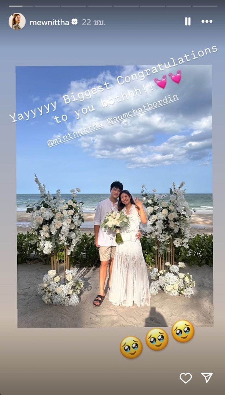 โดยในไอจีสตอรี่ @mewnittha ของสาวมิว ได้โพสต์ภาพบรรยากาศตอนที่น้องสาวถูกขอแต่งงาน พร้อมทั้งเขียนข้อความแสดงความยินดีไว้ว่า "Yayyyyy Bigest Congratulations to you bothhh!!" พร้อมทั้งแท็กไปที่ไอจีของว่าที่เจ้าบ่าวเจ้าสาว ต้องบอกว่าน้องมิ้นท์ น้องสาวของพี่มิว หน้าสวยหวานเหมือนพี่สาวเลยจริงๆ