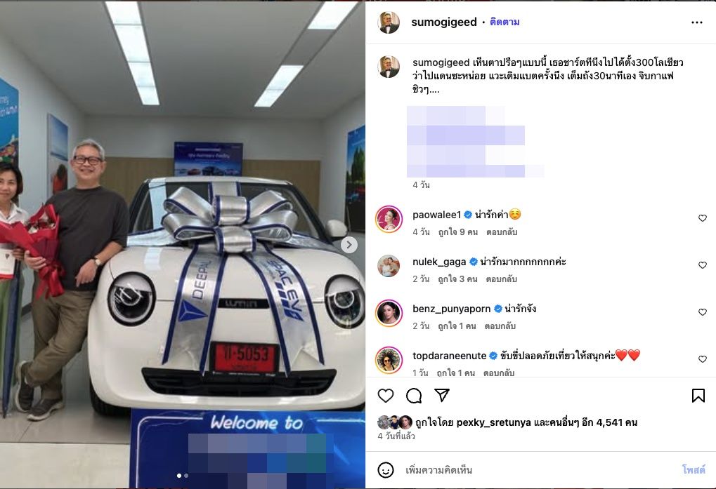 ซึ่ง ป๋ากิ๊ก ก็ได้โพสต์ภาพบรรยากาศในวันไปรับรถ พร้อมทั้งเขียนข้อความว่า “เห็นตาปรือๆ แบบนี้ เธอชาร์ตทีนึงไปได้ตั้ง 300 โลเชียวนะ ว่าไปแดนซะหน่อย แวะเติมแบตครั้งนึง เต็มถัง 30 นาทีเอง จิบกาแฟชิวๆ…”