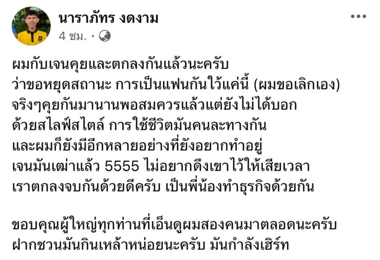 "ผมกับเจนคุยและตกลงกันแล้วนะครับ ว่าขอหยุดสถานะ การเป็นแฟนกันไว้แค่นี้ (ผมขอเลิกเอง) จริงๆ คุยกันมานานพอสมควรแล้ว แต่ยังไม่ได้บอก