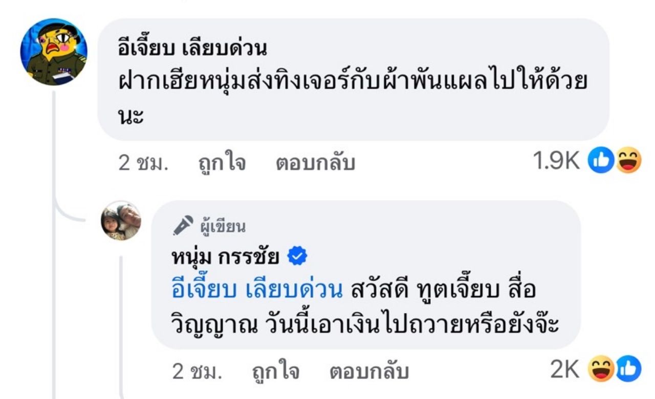 งานนี้ทำเอาชาวเน็ตที่ติดตามต่างแห่เข้ามาคอมเมนต์กันเพียบ พร้อมกับเขียนไปในทิศทางเดียวกันว่า รอใส่ใจ และรอฟังคุณครู อาทิ คุณครูมาแว้วววว รอครูอย่างเดียวเลย, อยากใส่ใจ, สีข้างหลุดหมดแล้ว, ฝากเฮียหนุ่มส่งทิงเจอร์กับผ้าพันแผลไปให้ด้วยนะ, คงแสบสีข้างน่าดู, คุณครูครับ มีคนแถ, แสบแย่เลยนะคะ, รอใส่ใจค่ะ เป็นต้น