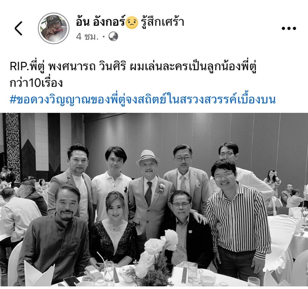 ทำเอาหลายคนต่างรู้สึกเศร้าไปตามๆ กัน หลังได้เห็นข้อความจากเฟซบุ๊ก กิ๊ก วรธนพจน์ หนึ่งในเพื่อนนักแสดง ได้โพสต์ภาพของ ตู่ พงศนารถ วินศิริ นักแสดงช่อง 7 ที่มีชื่อเสียงจากบทตัวร้ายในละคร เป็นภาพขาวดำแสดงความอาลัย พร้อมแคปชันว่า