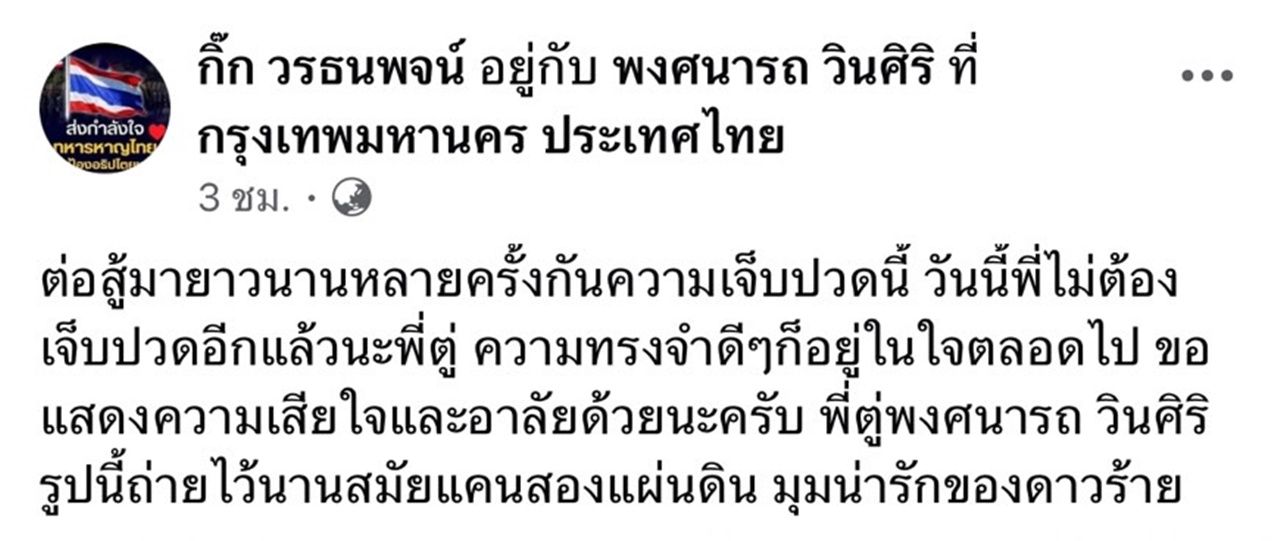 "ต่อสู้มายาวนานหลายครั้งกับความเจ็บปวดนี้ วันนี้พี่ไม่ต้องเจ็บปวดอีกแล้วนะพี่ตู่ ความทรงจำดีๆ ก็อยู่ในใจตลอดไป ขอแสดงความเสียใจและอาลัยด้วยนะครับ พี่ตู่ พงศนารถ วินศิริ รูปนี้ถ่ายไว้นานสมัยแคนสองแผ่นดิน มุมน่ารักของดาวร้าย"