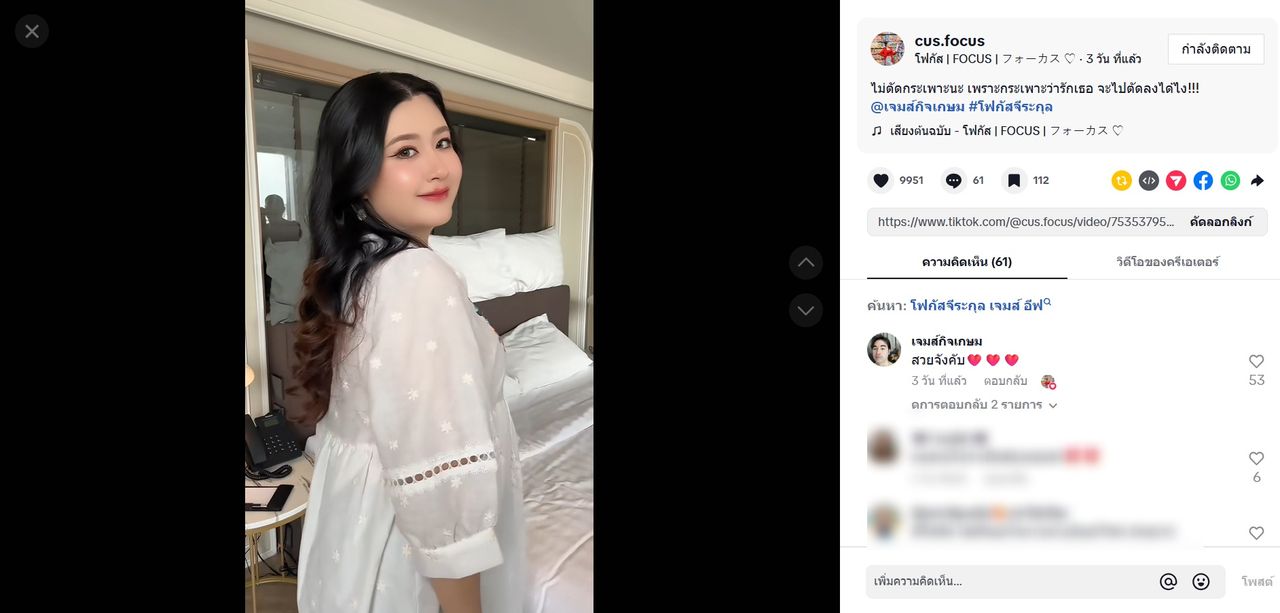 แต่งานนี้โฟกัสก็ไม่ทำให้ทุกคนสงสัยกันอีกต่อไป เมื่อเจ้าตัวโพสต์คลิปล่าสุดที่เผยให้เห็นความสวยหวาน พร้อมทั้งเขียนแคปชั่น “ไม่ตัดกระเพาะนะ เพราะกระเพาะว่ารักเธอ จะไปตัดลงได้ไง!!!” พร้อมทั้งแท็กไปที่ TikTok ของเจมส์ กิจเกษม หรือ เจมส์ B.O.Y หวานใจของเธอด้วย ซึ่งเจมส์ก็คอมเมนต์ว่า "สวยจังคับ" และใส่อีโมจิหัวใจด้วย