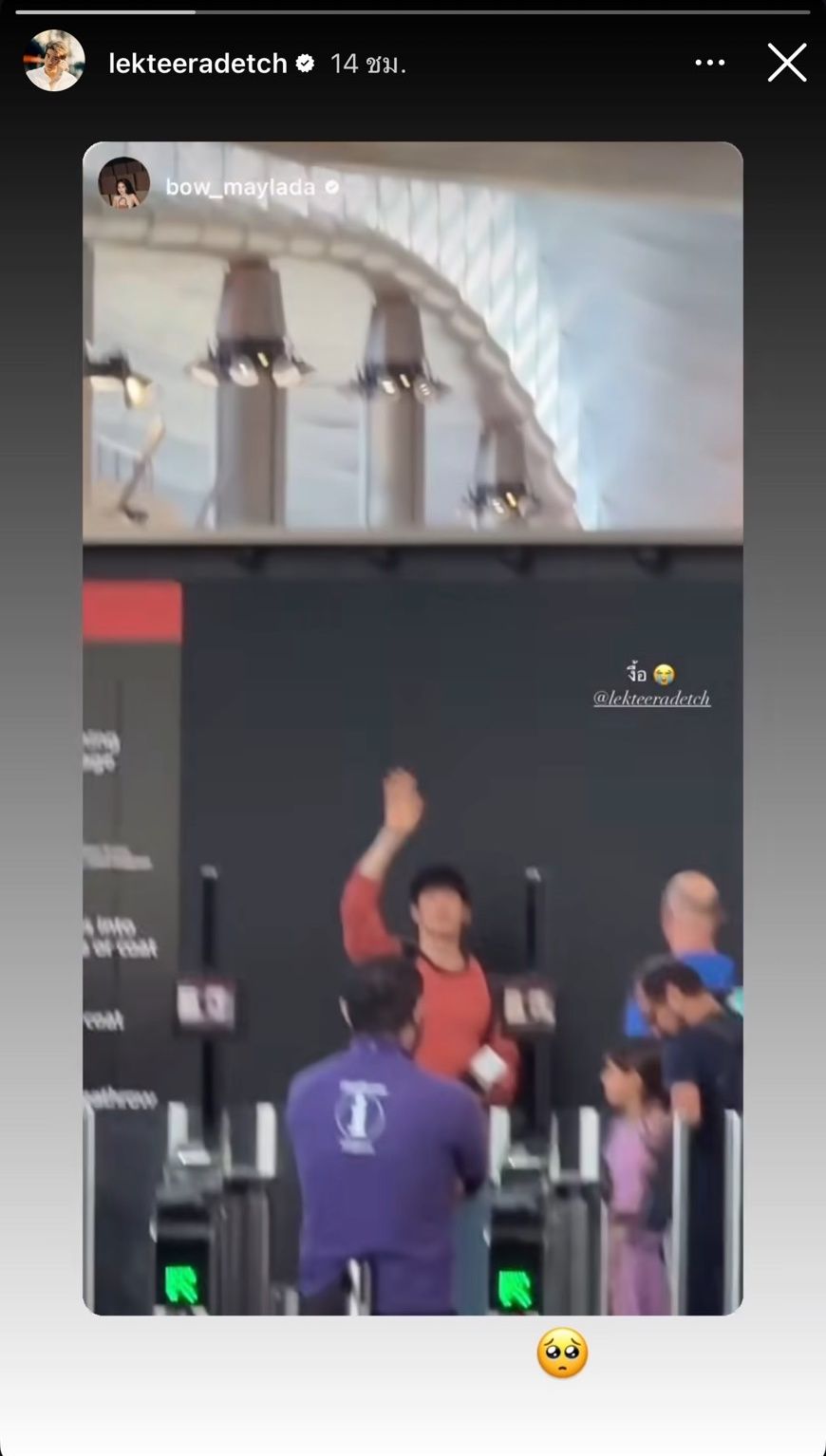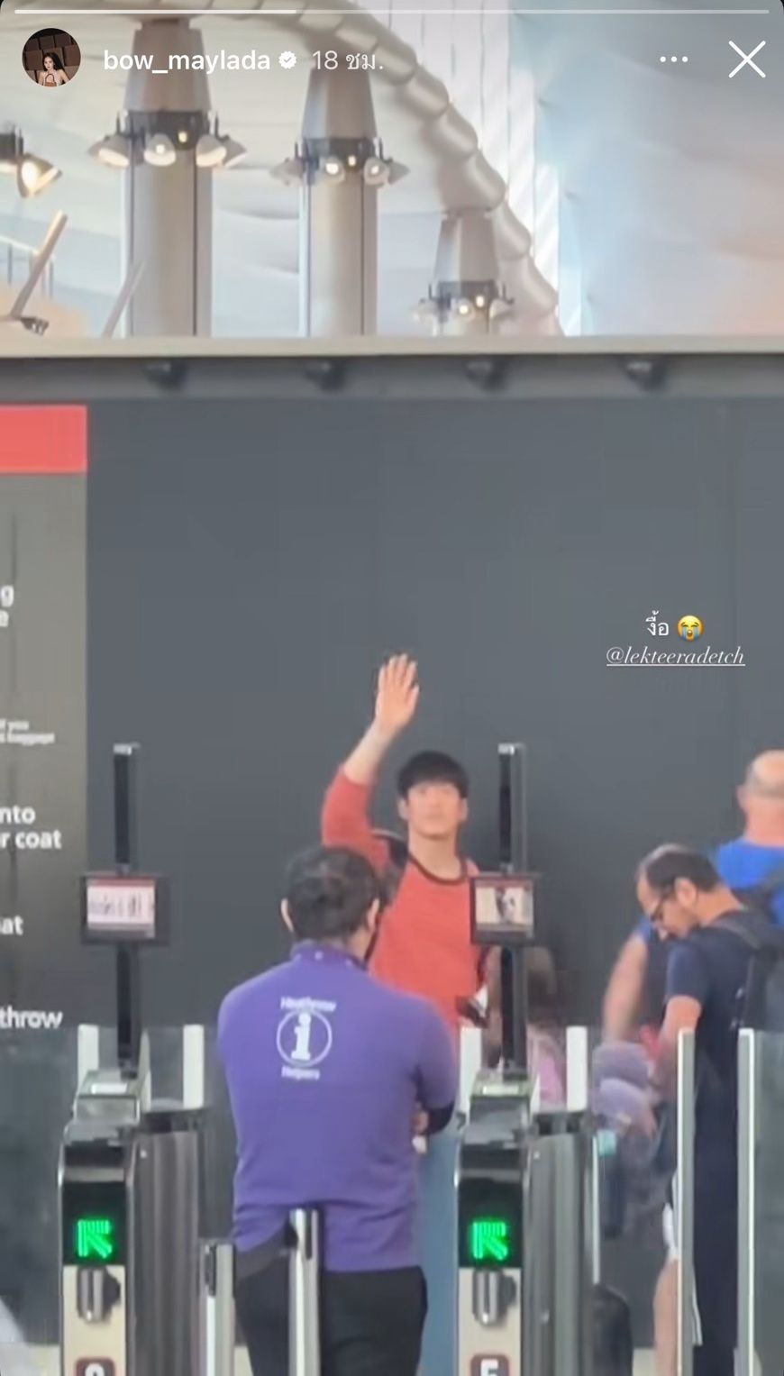 ซึ่งในไอจีสตอรี่ของโบว์ก็ได้โพสต์คลิปตอนที่ไปส่งอาเล็กที่สนามบิน พร้อมทั้งเขียนข้อความ “งื้อ” และใส่อีโมจิร้องไห้ พร้อมทั้งแท็กไอจีของอาเล็ก ในขณะที่อาเล็กก็รีโพสต์ไอจีสตอรี่และใส่อีโมจิหน้าเศร้าด้วย