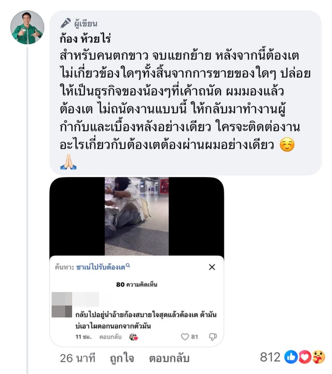 และได้โพสต์ภาพที่แคปมาจาก TikTok เพิ่มว่า "สำหรับคนตกข่าว จบแยกย้าย หลังจากนี้ต้องเตไม่เกี่ยวข้องใดๆ ทั้งสิ้นจากการขายของใดๆ ปล่อยให้เป็นธุรกิจของน้องๆ ที่เค้าถนัด ผมมองแล้วต้องเต ไม่ถนัดงานแบบนี้ ให้กลับมาทำงานผู้กำกับและเบื้องหลังอย่างเดียว ใครจะติดต่องานอะไรเกี่ยวกับต้องเตต้องผ่านผมอย่างเดียว"