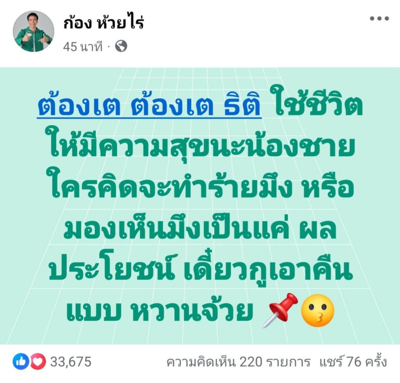 ทำเอาหลายคนต่างสงสัยว่าเกิดอะไรขึ้น หลังเห็นโพสต์สุดเดือดของ ก้อง ห้วยไร่ ที่ได้โพสต์ข้อความว่า "ต้องเต ต้องเต ธิติ ใช้ชีวิตให้มีความสุขนะน้องชาย ใครคิดจะทำร้ายมึง หรือมองเห็นมึงเป็นแค่ ผลประโยชน์ เดี๋ยวกูเอาคืนแบบ หวานจ้วย"