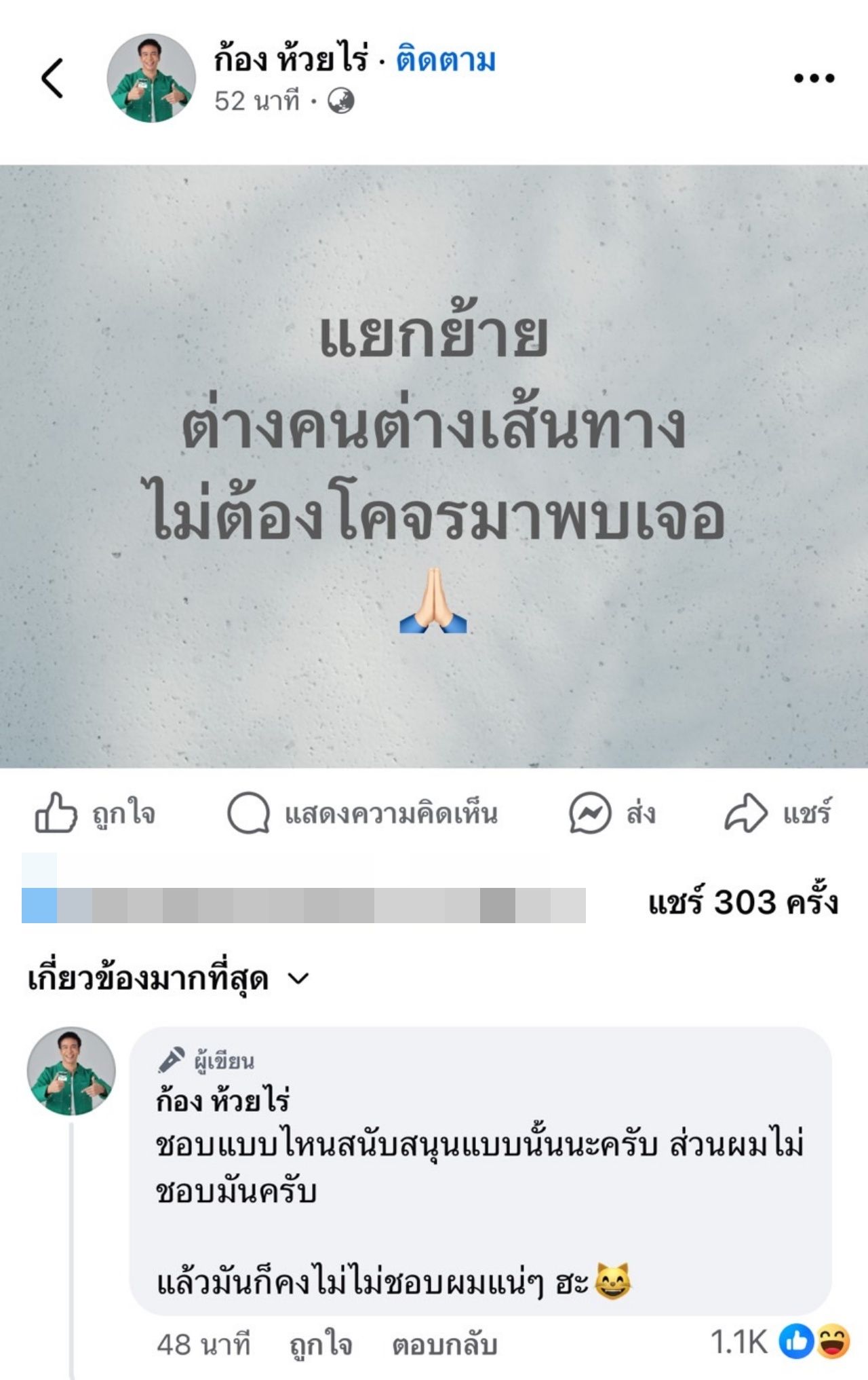 จากนั้น ก้อง ก็ได้โพสต์อีกว่า "แยกย้าย ต่างคนต่างเส้นทาง ไม่ต้องโคจรมาพบเจอ" และโพสต์ในคอมเมนต์เพิ่มว่า "ชอบแบบไหนสนับสนุนแบบนั้นนะครับ ส่วนผมไม่ชอบมันครับ แล้วมันก็คงไม่ชอบผมแน่ๆ ฮะ"