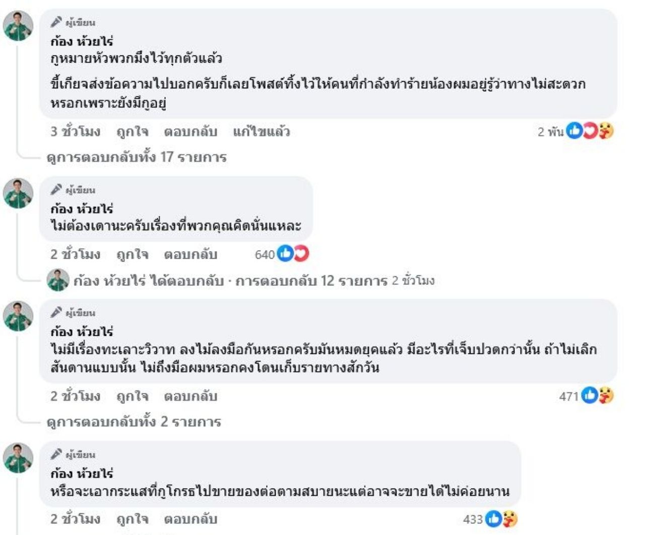 และได้โพสต์รัวๆ ใต้คอมเมนต์ว่า "กูหมายหัวพวกมึงไว้ทุกตัวแล้ว ขี้เกียจส่งข้อความไปบอกครับก็เลยโพสต์ทิ้งไว้ให้คนที่กำลังทำร้ายน้องผมอยู่รู้ว่าทางไม่สะดวกหรอกเพราะยังมีกูอยู่" , "ไม่ต้องเดานะครับเรื่องที่พวกคุณคิดนั่นแหละ", "ไม่มีเรื่องทะเลาะวิวาท ลงไม้ลงมือกันหรอกครับมันหมดยุคแล้ว มีอะไรที่เจ็บปวดกว่านั้น ถ้าไม่เลิกสันดานแบบนั้น ไม่ถึงมือผมหรอกคงโดนเก็บรายทางสักวัน" , "หรือจะเอากระแสที่กูโกรธไปขายของต่อตามสบายนะแต่อาจจะขายได้ไม่ค่อยนาน"