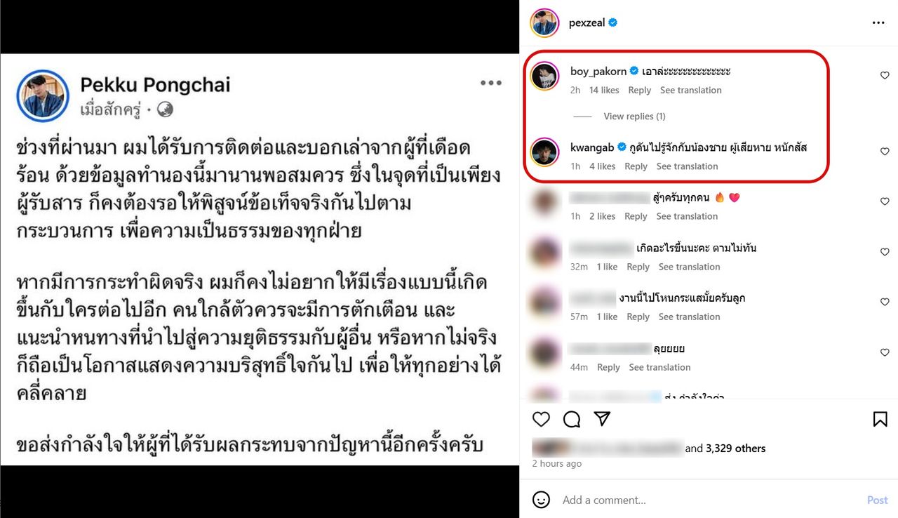 โดยหลังจากที่ เป๊กซ์ Zeal โพสต์ข้อความทั้งในเฟซบุ๊กและไอจี บอย ปกรณ์ ก็คอมเมนต์ว่า “เอาล่ะะะะะะะะะะะะะะ” ในขณะที่ กวาง AB Normal ก็บอกว่า “กูดันไปรู้จักกับน้องชาย ผู้เสียหาย หนักสัส”