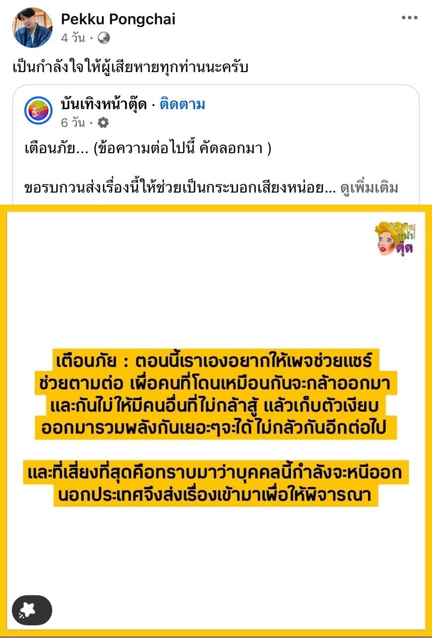 หลังจากที่นักร้องหนุ่ม เป๊กซ์ ปราชญ์ พงษ์ไชย หรือ เป๊กซ์ Zeal ได้แชร์โพสต์ของเพจ บันเทิงหน้าตุ๊ด ที่มีเนื้อหาเตือนภัยสาวคนหนึ่งที่หลอกลวงคนในวงการบันเทิงให้มาทำโปรเจกต์หรือร่วมลงทุน แต่พอมีปัญหากลับโยนความผิดให้ลูกค้าแล้วล้มโปรเจกต์ไป และมีผู้เสียหายหลายกลุ่ม