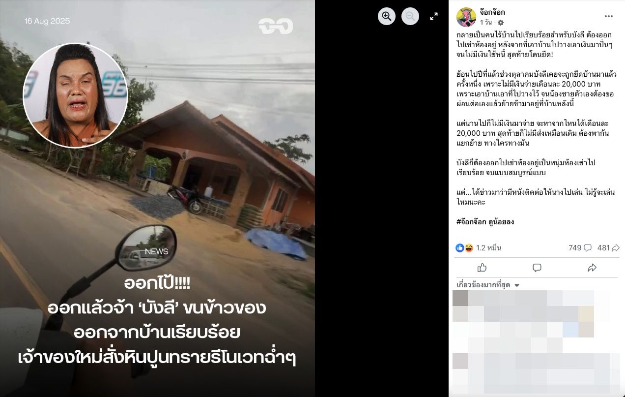 ซึ่งในเพจดัง จ๊อกจ๊อก โพสต์เล่าถึงเรื่องราวชีวิตล่าสุดของแม่หญิงลี ที่ตอนนี้กลายเป็นคนไร้บ้าน พร้อมทั้งเผยสาเหตุที่ทำให้กลายเป็นแบบนี้ โดยบอกว่า “กลายเป็นคนไร้บ้านไปเรียบร้อยสำหรับบังลี ต้องออกไปเช่าห้องอยู่ หลังจากที่เอาบ้านไปวางเอาเงินมาปั่นๆ จนไม่มีเงินใช้หนี้ สุดท้ายโดนยึด!