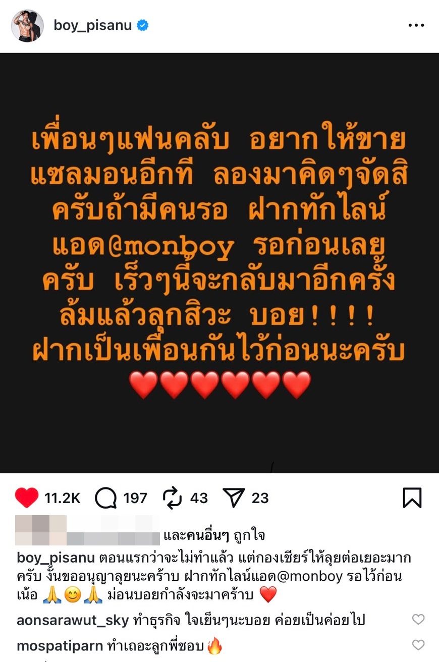 “บอยขออนุญาตไม่ลงรายละเอียดแล้วดีกว่านะครับ เพราะว่ามันพูดแล้วมันจะไม่จบ ผมอยากจบเรื่องนี้แล้ว ผมอยากจะทำธุรกิจของผมต่อไปแล้ว เรื่องที่ผ่านมาผมว่ามันเป็นข่าวเยอะมากแล้ว แล้วผมก็มีความรู้สึกว่าคนก็น่าจะเบื่อเราแล้วที่จะมาสัมภาษณ์ หรือมารับฟังเรื่องราวอะไรพวกนี้ ผมขอโฟกัสงานใหม่ๆ ที่จะมีโอกาสทำในอนาคตดีกว่า”