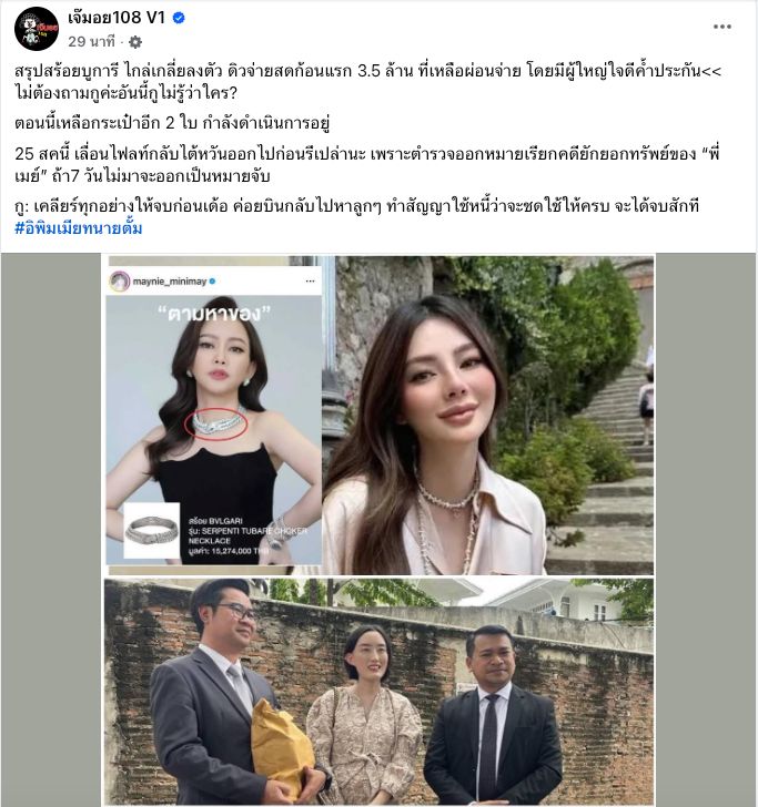 ล่าสุดเพจบันเทิงดัง เจ๊มอย108 V1 เผยถึงความคืบหน้าปมสร้อยงูจากแบรนด์ดัง BVLGARI รวมไปถึงไฟล์ทบินกลับไต้หวันของดิวในวันที่ 25 ส.ค. นี้ว่าอาจจะต้องเลื่อนออกไป หลังตำรวจออกหมายเรียกดิวในคดียักยอกทรัพย์