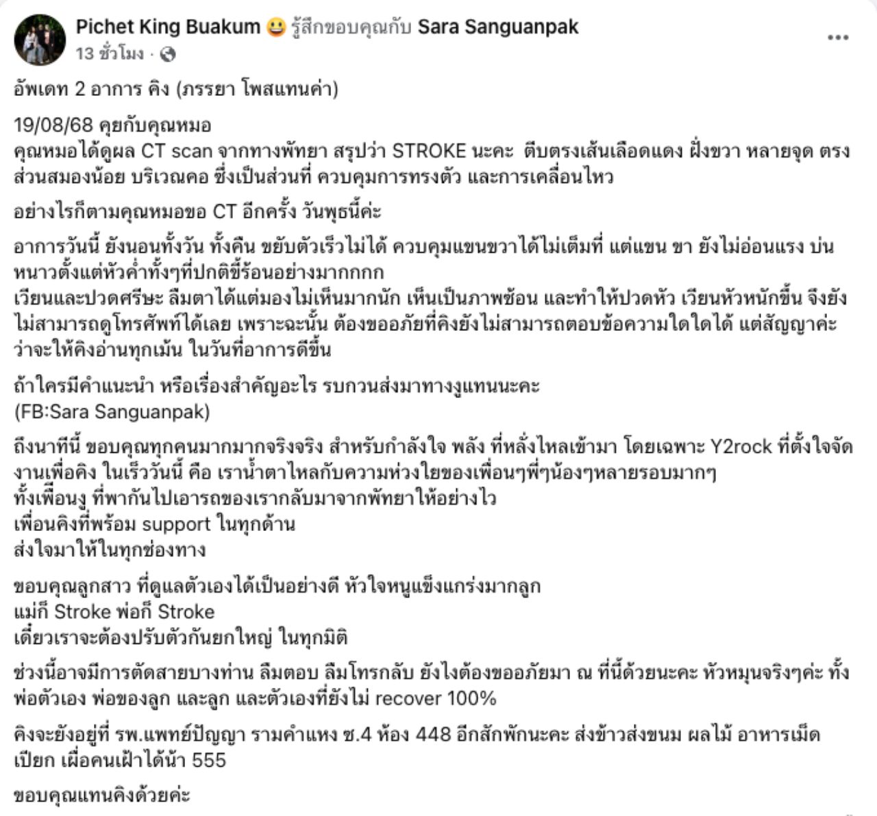 วันต่อมาภรรยาก็ได้อัพเดทเพิ่มเติมว่า คิง เดอะวอยซ์ ได้ป่วยเป็นสโตรก ก่อนที่คุณหมอจะสั่งซีทีสแกนอีกครั้ง เพราะหวั่นจะมีอาการสมองบวม